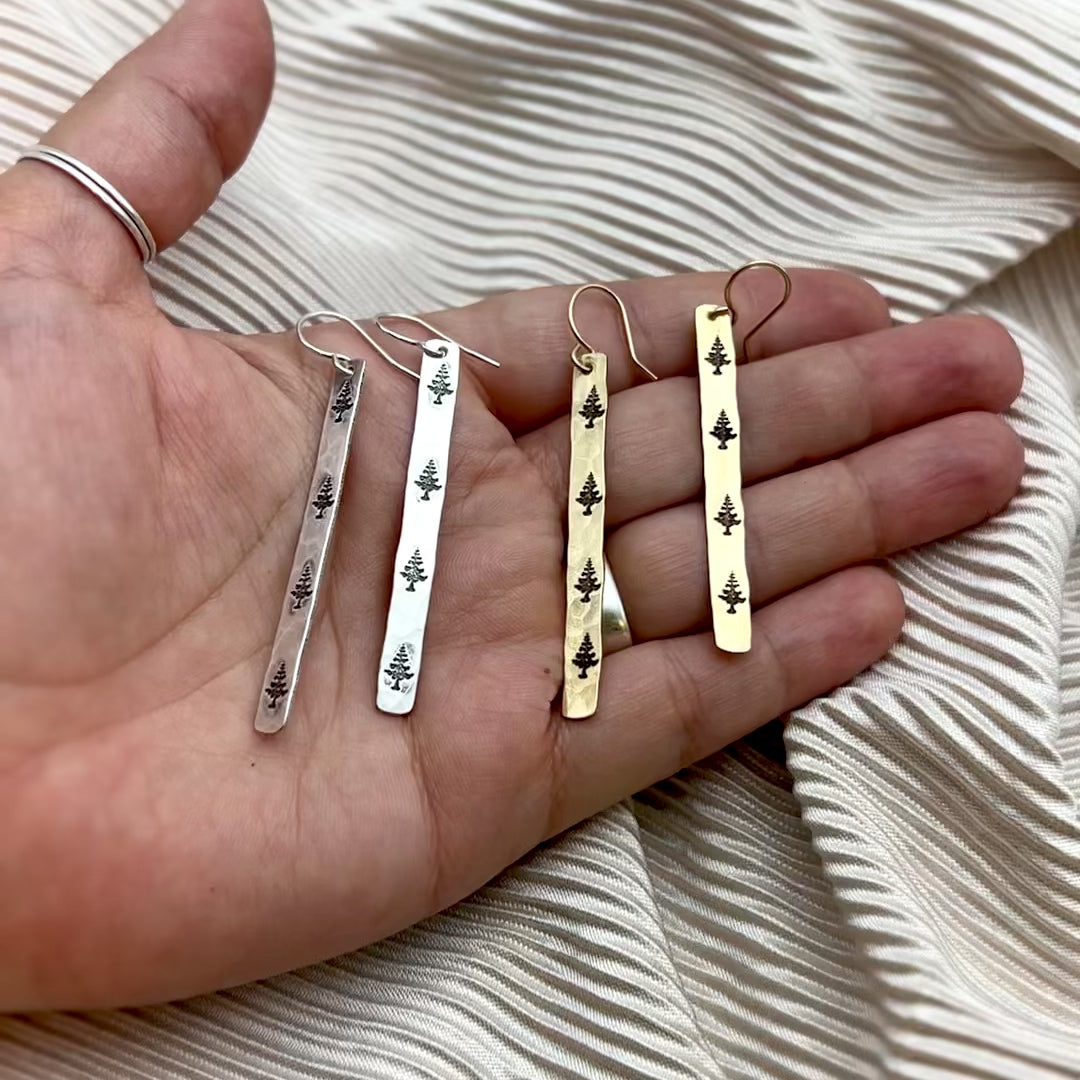Textured brass or silver pendants are hand stamped with trees and hang from 14 karat gold filled or sterling silver ear wire.