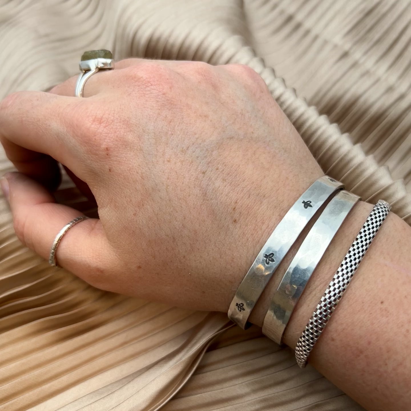 Material Note: Our cuffs are crafted from raw jeweler’s brass and sterling silver–plated brass. Because raw brass naturally interacts with each person’s unique skin chemistry, reactions can vary—some wearers will enjoy a lasting shine with no change, while others may notice a temporary green tint where the cuff touches their skin. This is a normal and harmless reaction that depends on your body’s pH.