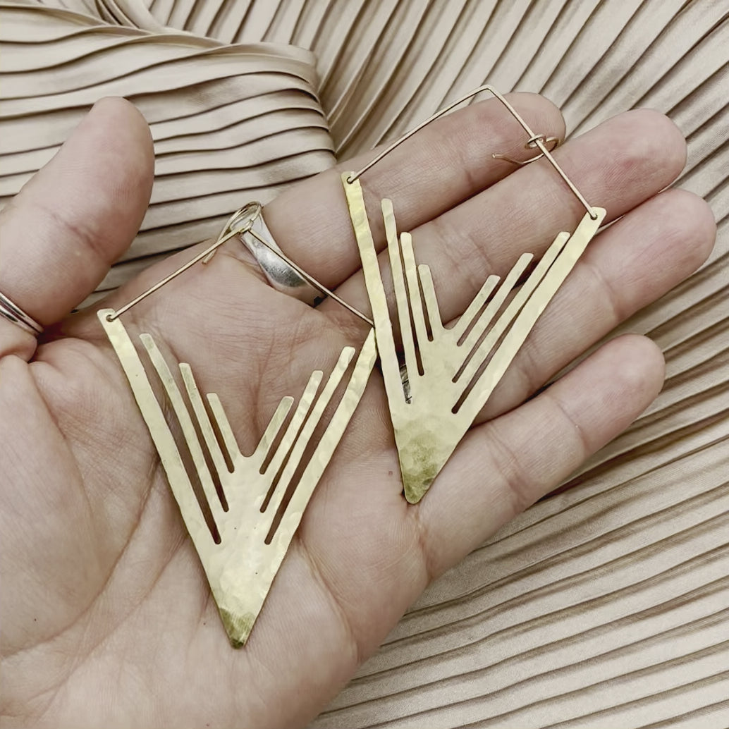 Brass or silver abstract pendants hang from 14 karat gold filled or sterling silver handmade ear wire.