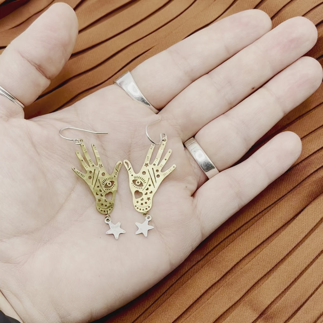 Hand pendants hang above a star charm from 14 karat gold filled or silver ear wire. Available in gold, silver or mixed metal.