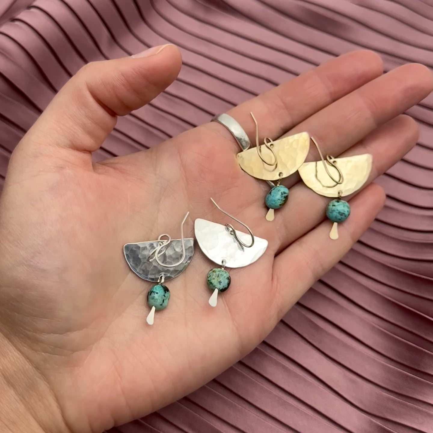 The Cleo Earrings are a little love letter to texture and color. Metal half moons meet a genuine turquoise nugget dangle, finished on handmade sterling silver or 14k gold filled ear wires. ♡