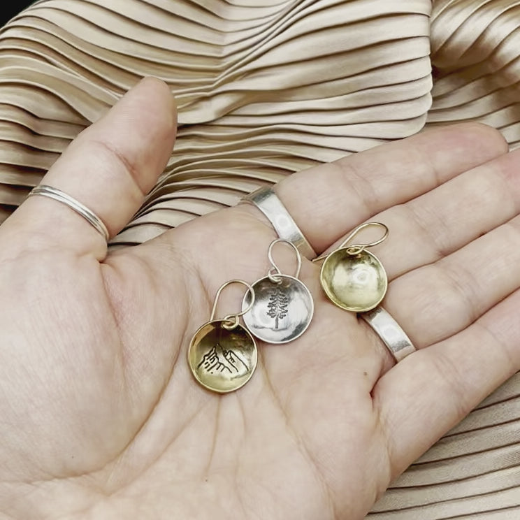 Dapped brass or sterling silver plated brass pieces dangle from 14k gold filled or sterling silver ear wire.