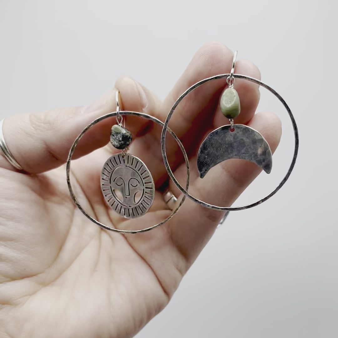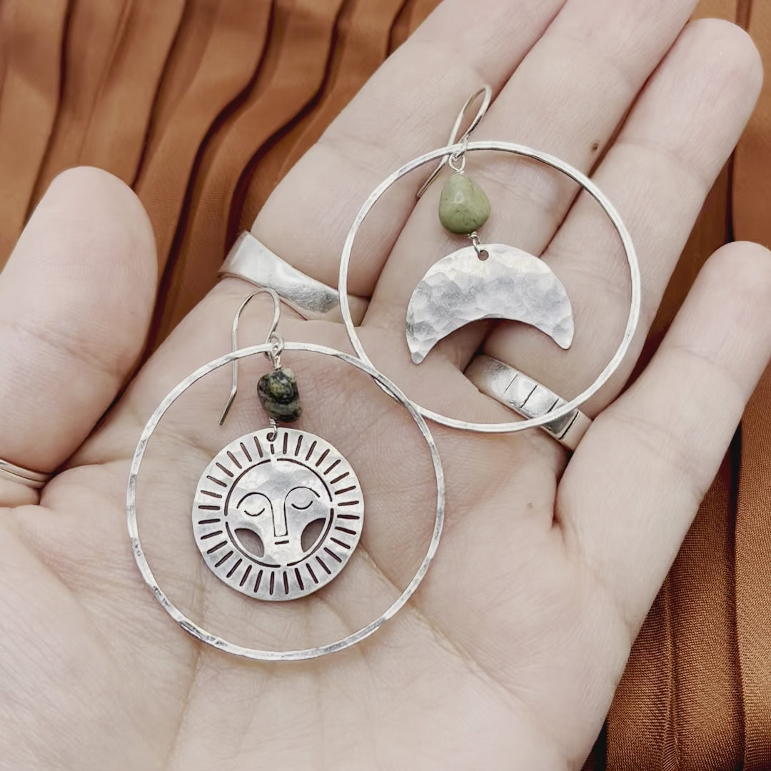 Textured brass or sterling silver plated brass pieces with attached turquoise chunk beads dangle from 14k gold filled or sterling silver ear wire.