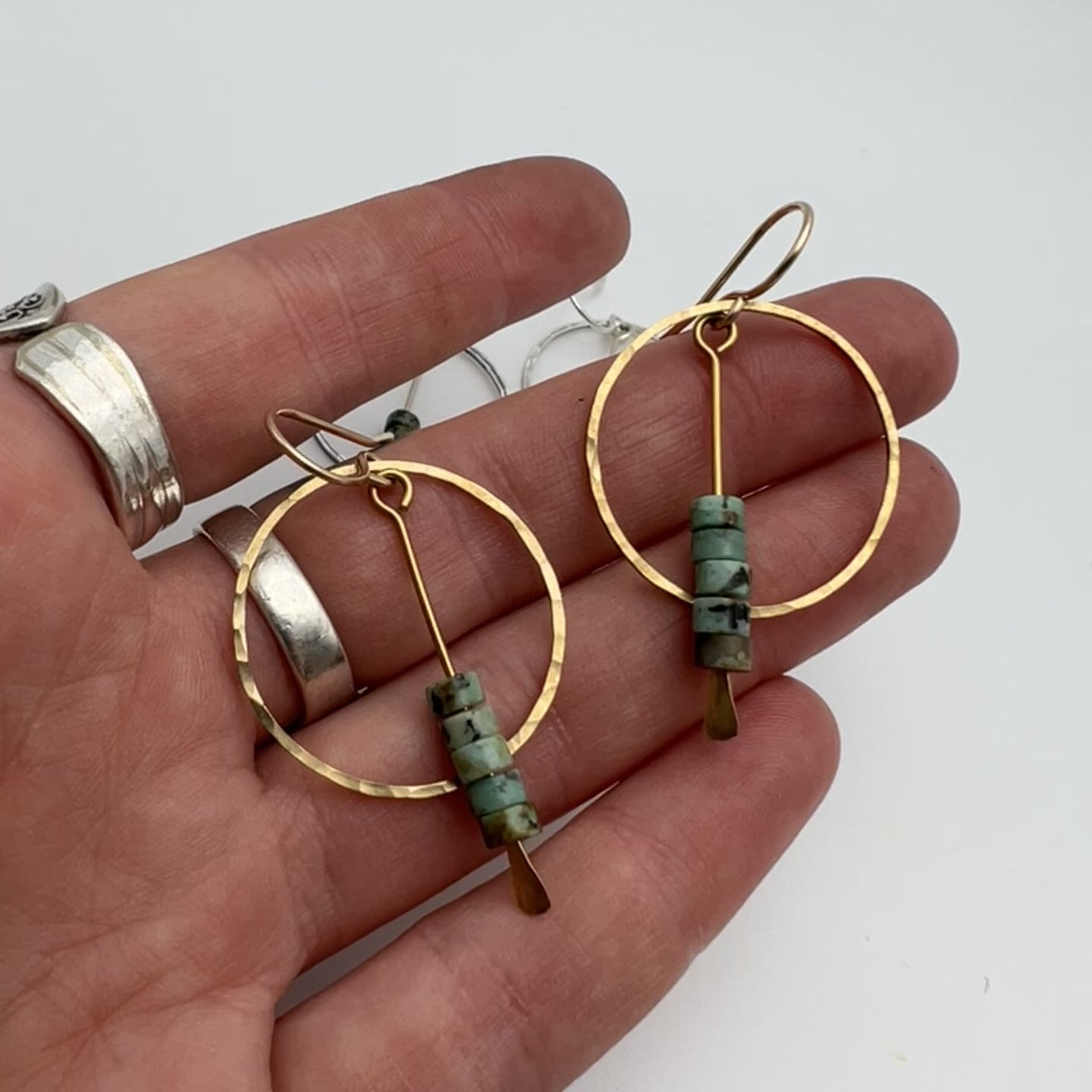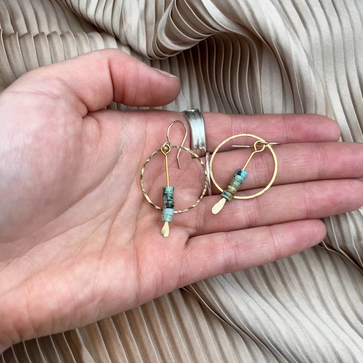 Inspired by the non-profit Dress For Success, these gold or silver textured hoops and Turquoise Heisi beads hang from 14 karat gold filled or sterling silver ear wire.