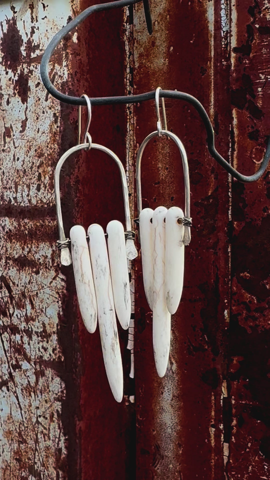 Turquoise, Ivory, Black or Evergreen Howlite points hang from a textured gold or silver arch pendant and 14k karat gold filled or sterling silver ear wire.