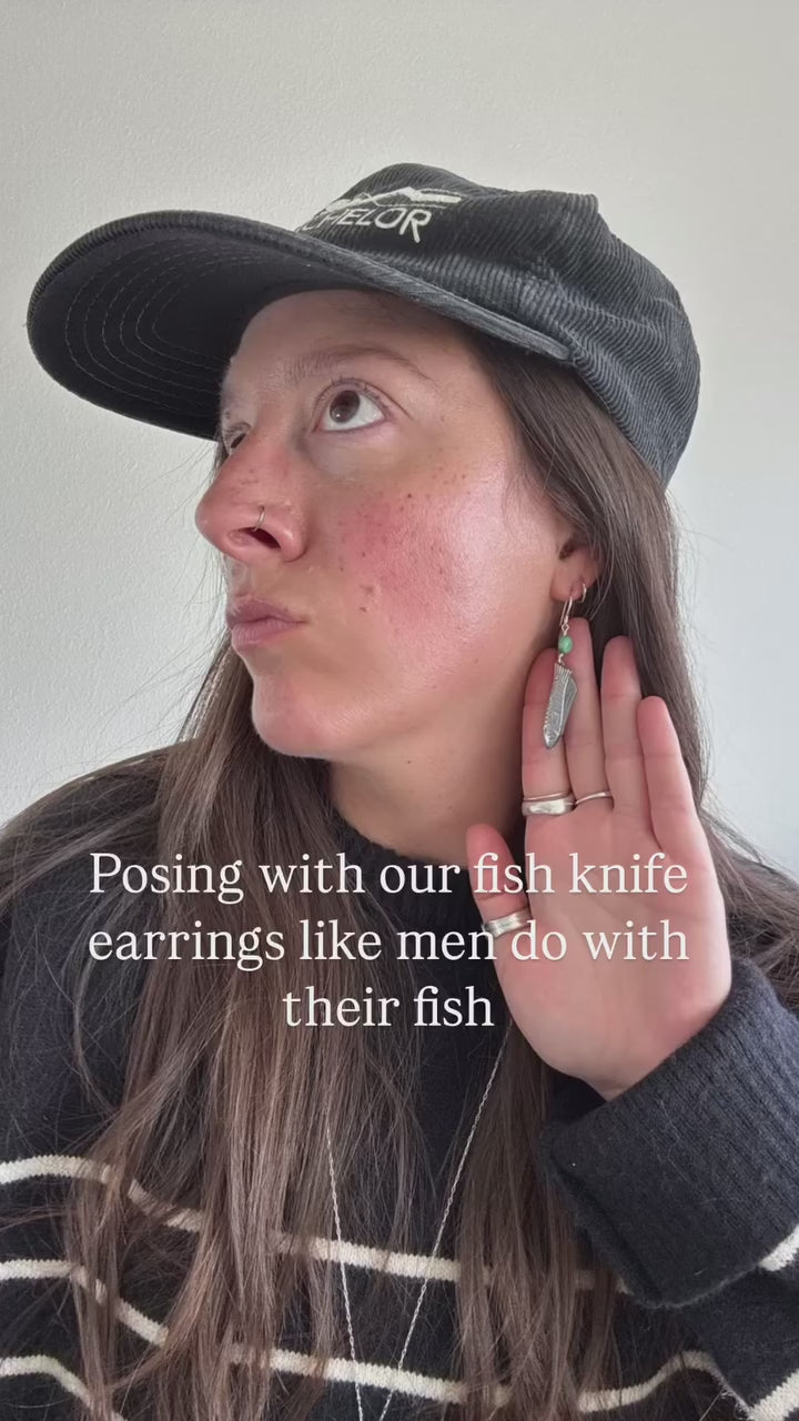 Functioning miniature fish utility tool pendant on sterling silver or 14 karat gold fill ear wire.