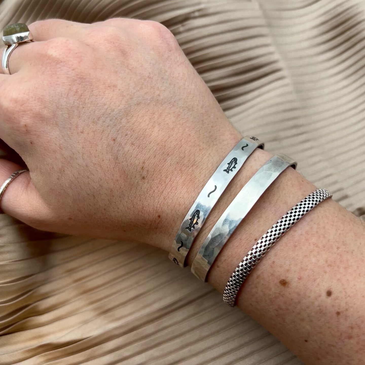 Material Note: Our cuffs are crafted from raw jeweler’s brass and sterling silver–plated brass. Because raw brass naturally interacts with each person’s unique skin chemistry, reactions can vary—some wearers will enjoy a lasting shine with no change, while others may notice a temporary green tint where the cuff touches their skin. This is a normal and harmless reaction that depends on your body’s pH.