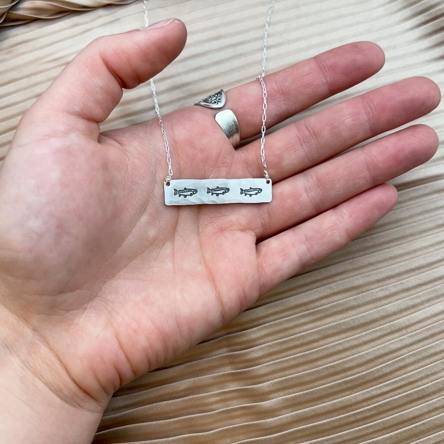 Fish stamped bar pendant (horizontal) hangs from a 14 karat gold filled or sterling silver chain.