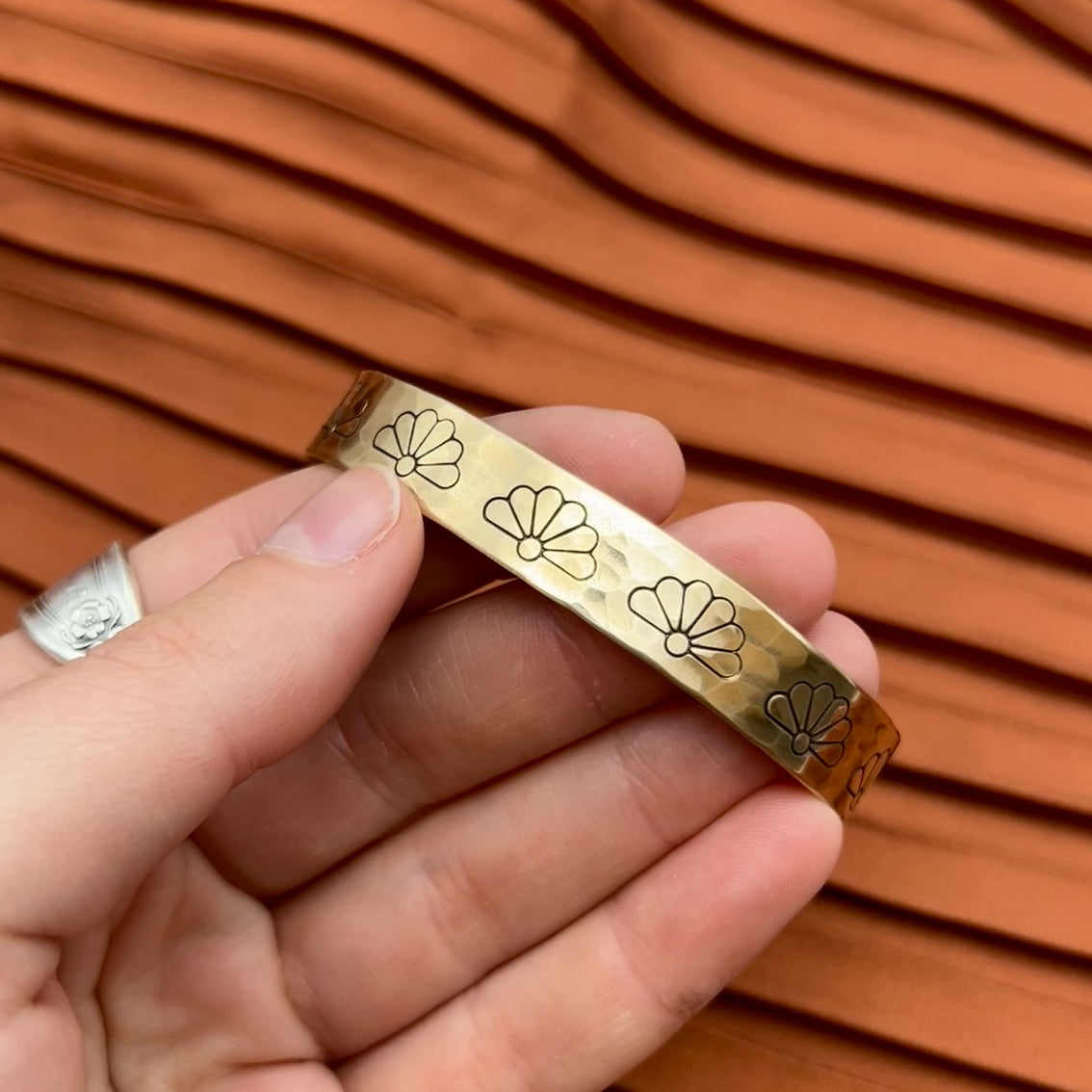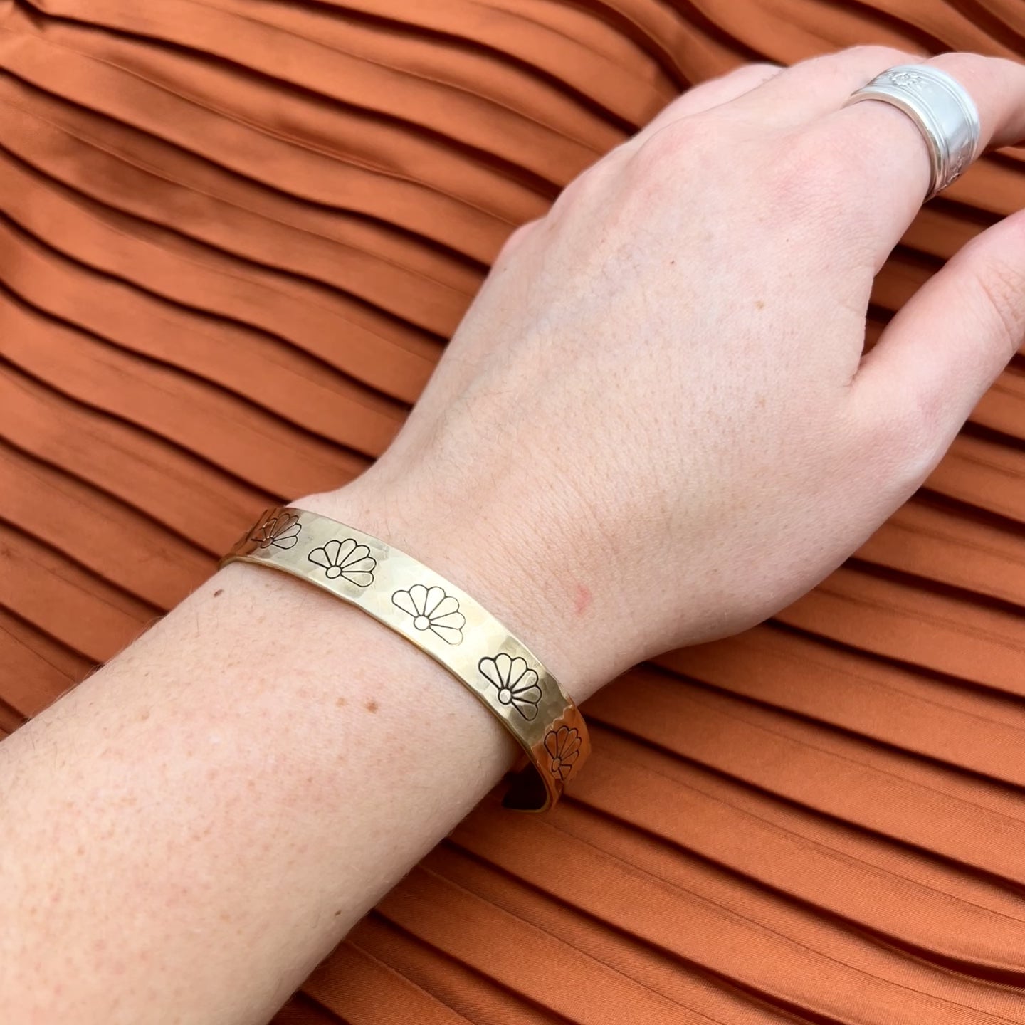 Beautiful hand stamped half flowers on an adjustable size cuff. Available in either gold or silver