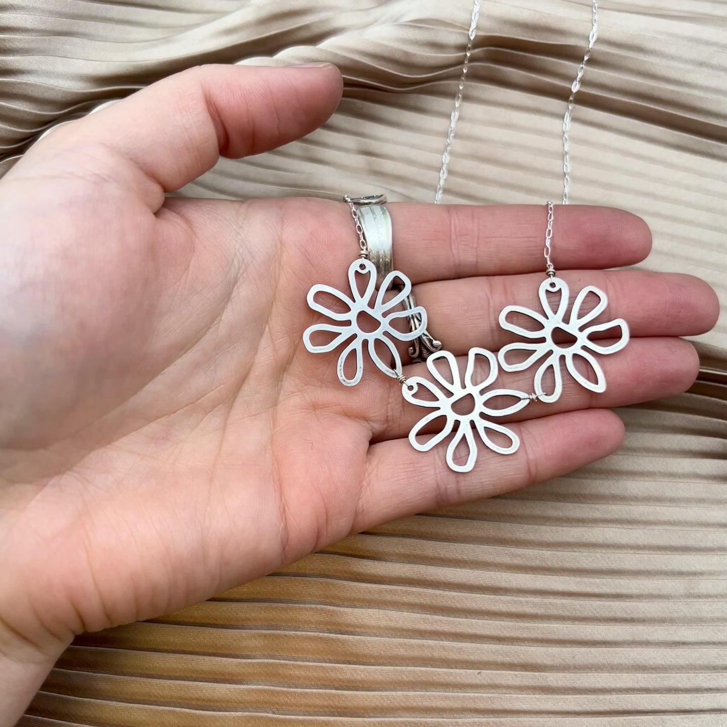 Gold or silver floral pendants wire wrapped together to hang naturally from a 14k gold filled or sterling silver chain. Offered in various lengths. Matching earrings available!