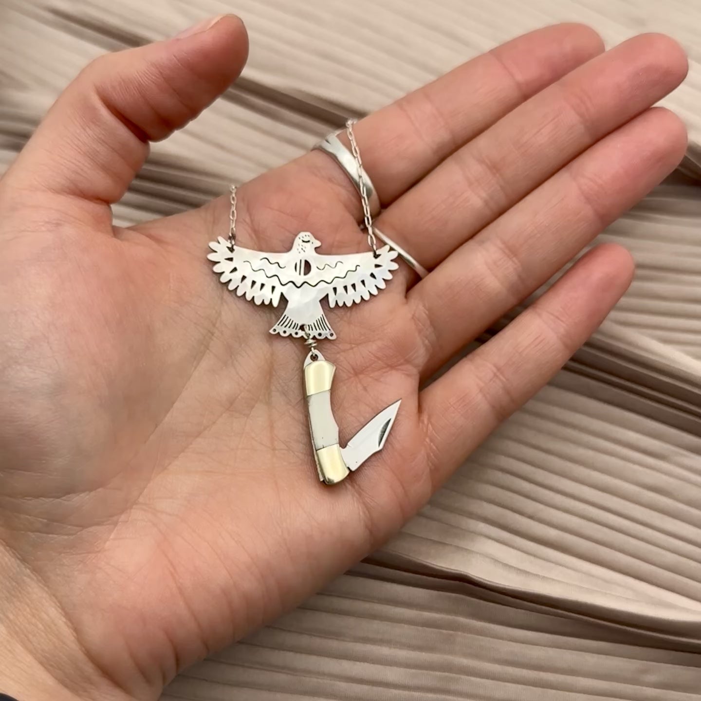 Please note: If the utility tool is only shown in gold, that means it is only available in gold. However, you can choose between a gold or silver chain and eagle pendant, as pictured. Your selected chain color will apply to the necklace, not the tool itself.