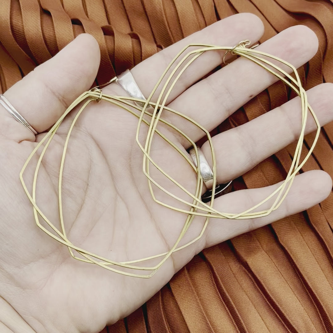 Large gold or silver square hoops that hang from 14 karat gold filled or sterling silver ear wire.