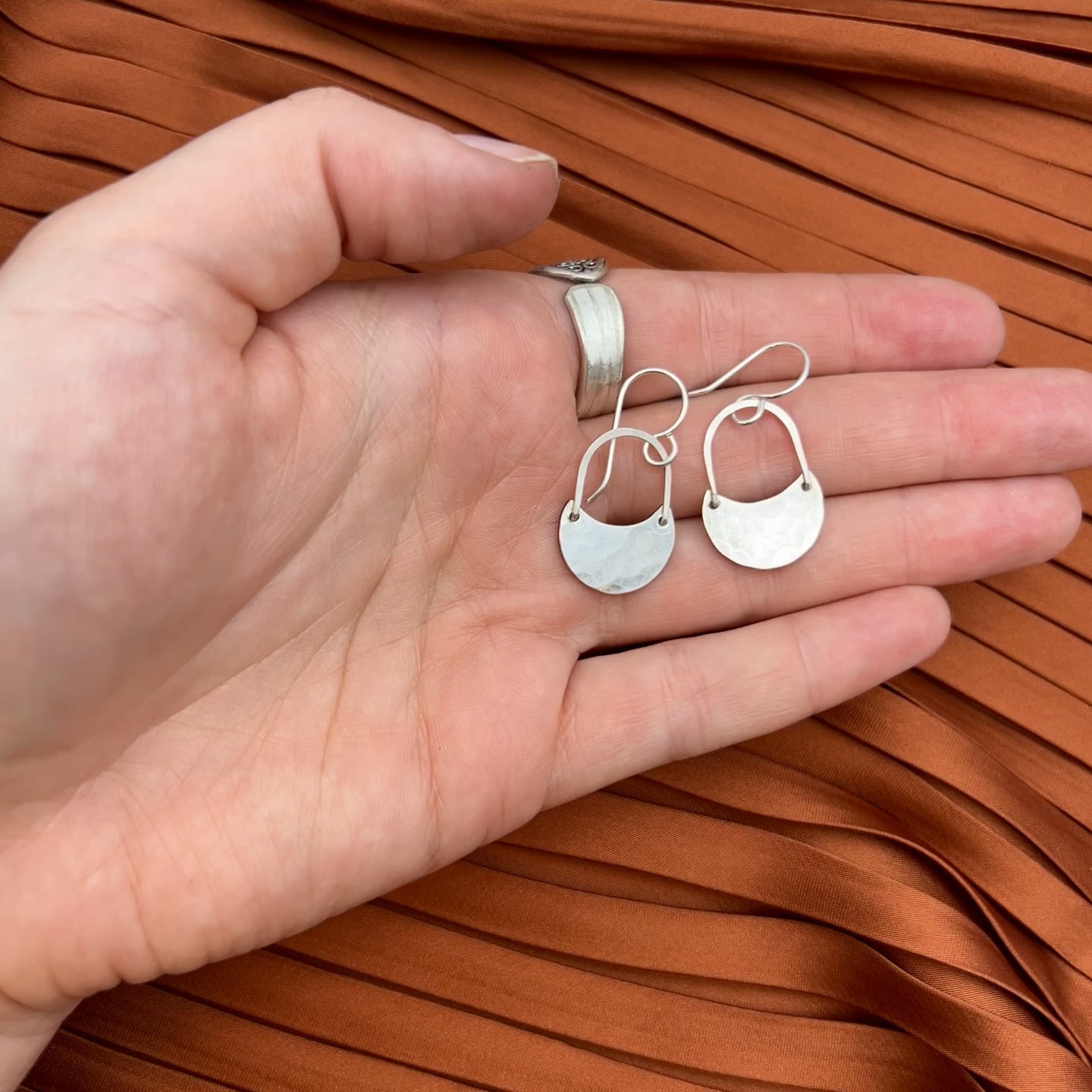 Hammered crescent pendant that hangs from 14 karat gold filled or sterling silver ear wire.