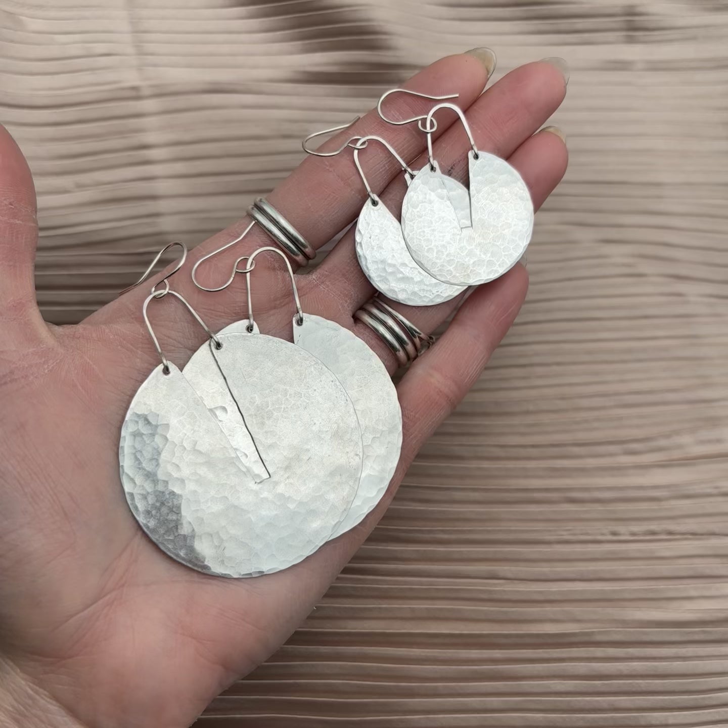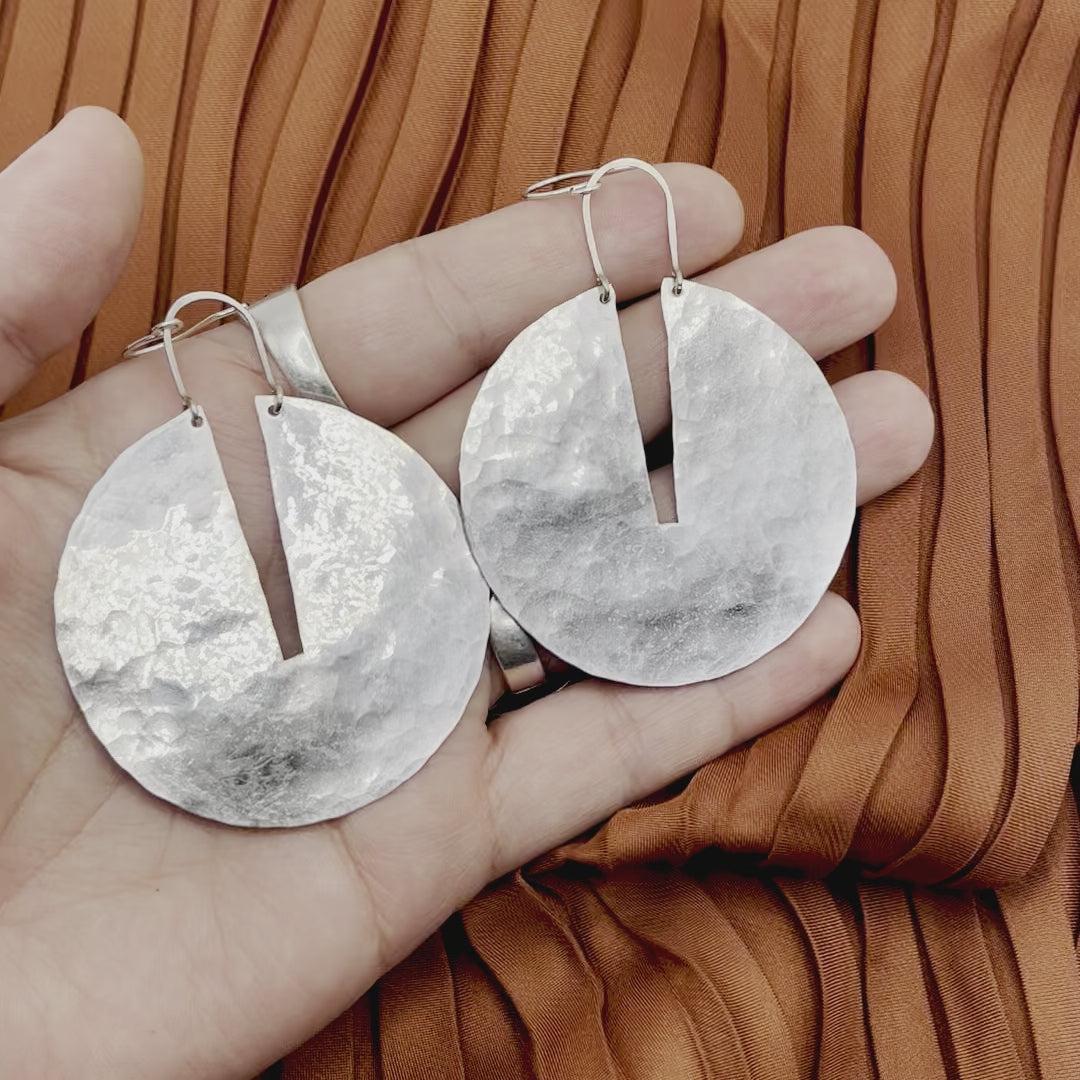 A statement piece with timeless style. The Good Measure Earrings feature large textured circle pendants with a deep cut out at the top, creating a bold yet balanced silhouette. Available in gold or silver, each pendant hangs from a sterling silver or 14k gold-filled handmade ear wire for a refined finish.