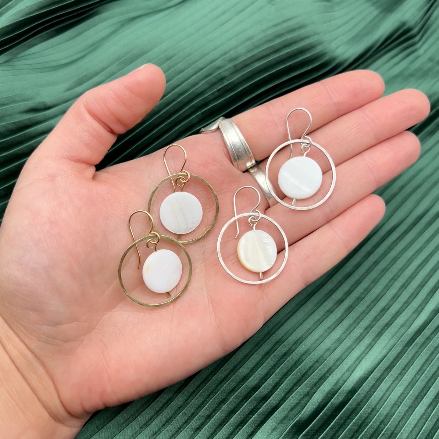 Sterling Silver plated brass or Raw Brass Hoops surrounding a Mother of Pearl bead dangle. With 14 karat Gold Filled or Sterling Silver ear wire.