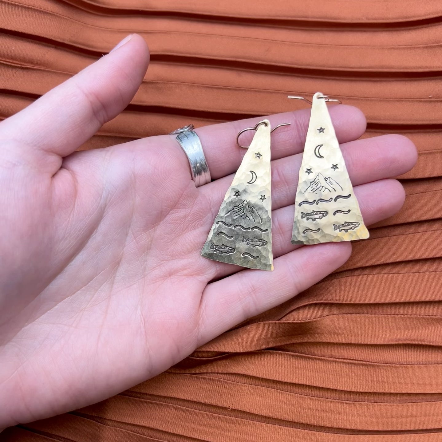River scene stamped triangle pendants that hang from sterling silver or 14 karat gold filled ear wire.