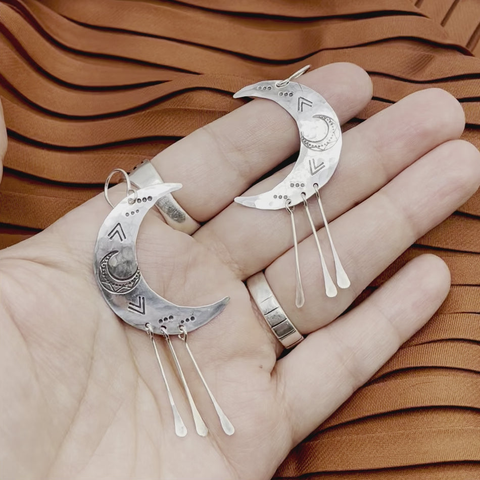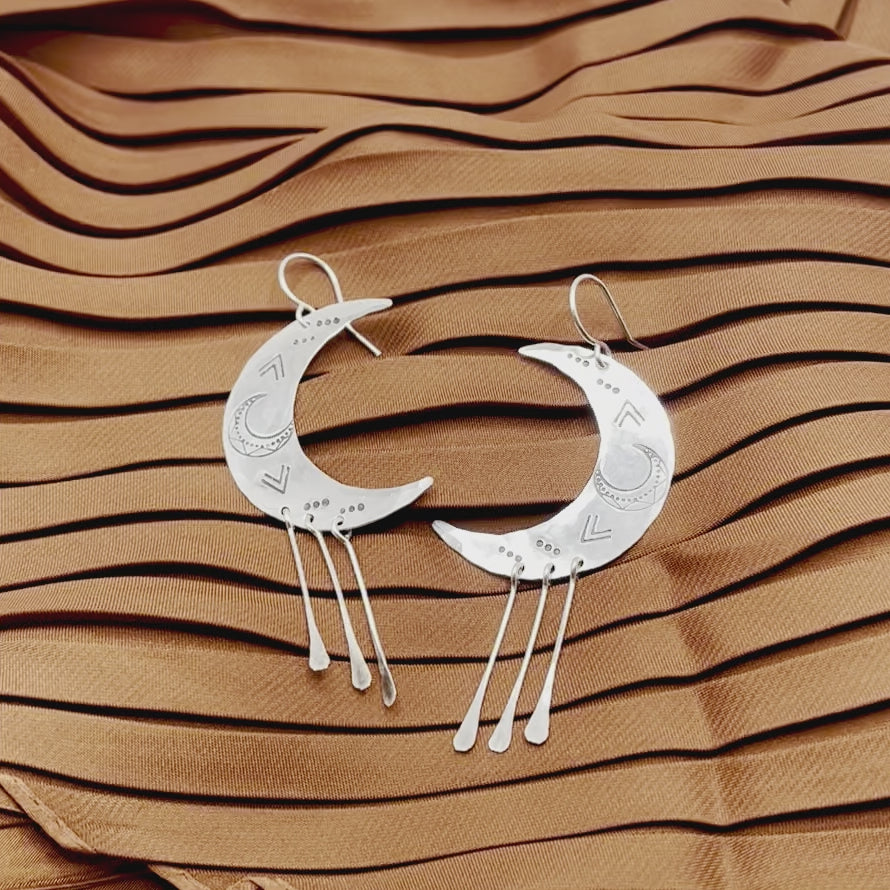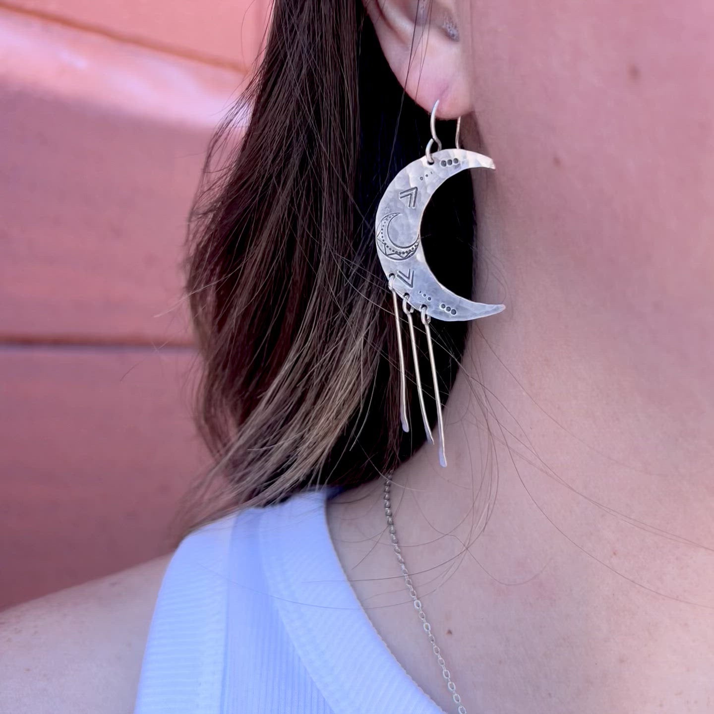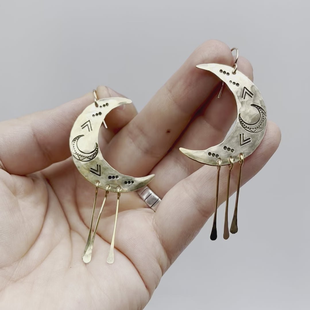 Hand stamped gold or silver crescent moon pendant that hangs from 14 karat gold filled or sterling silver ear wire.