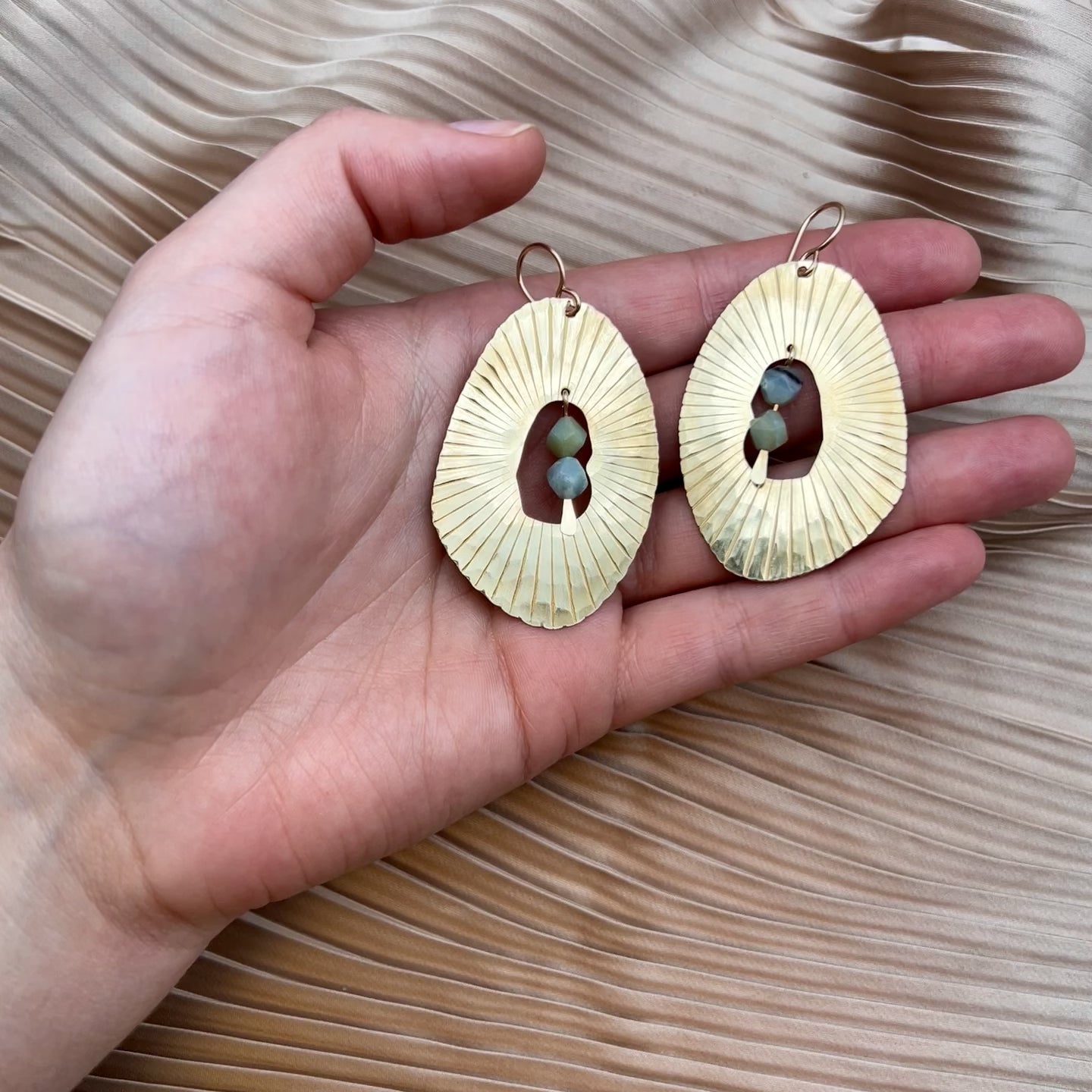 Gold or silver organic shaped pendants with two amazonite beads that hang from 14 karat gold filled or sterling silver ear wire.