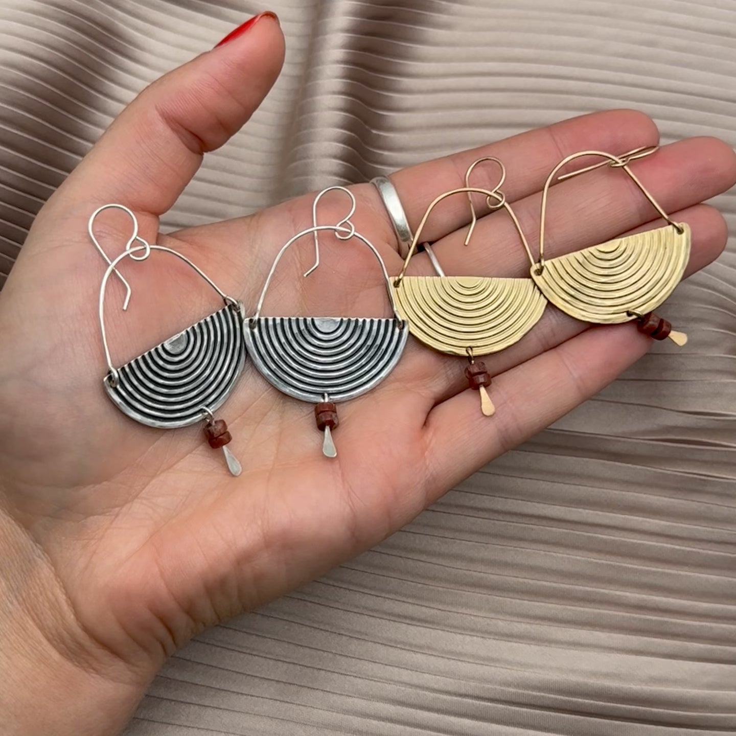Gold or silver semi circle pendants with Red Jasper Beads hang from handmade 14 karat gold filled or sterling silver ear wire.