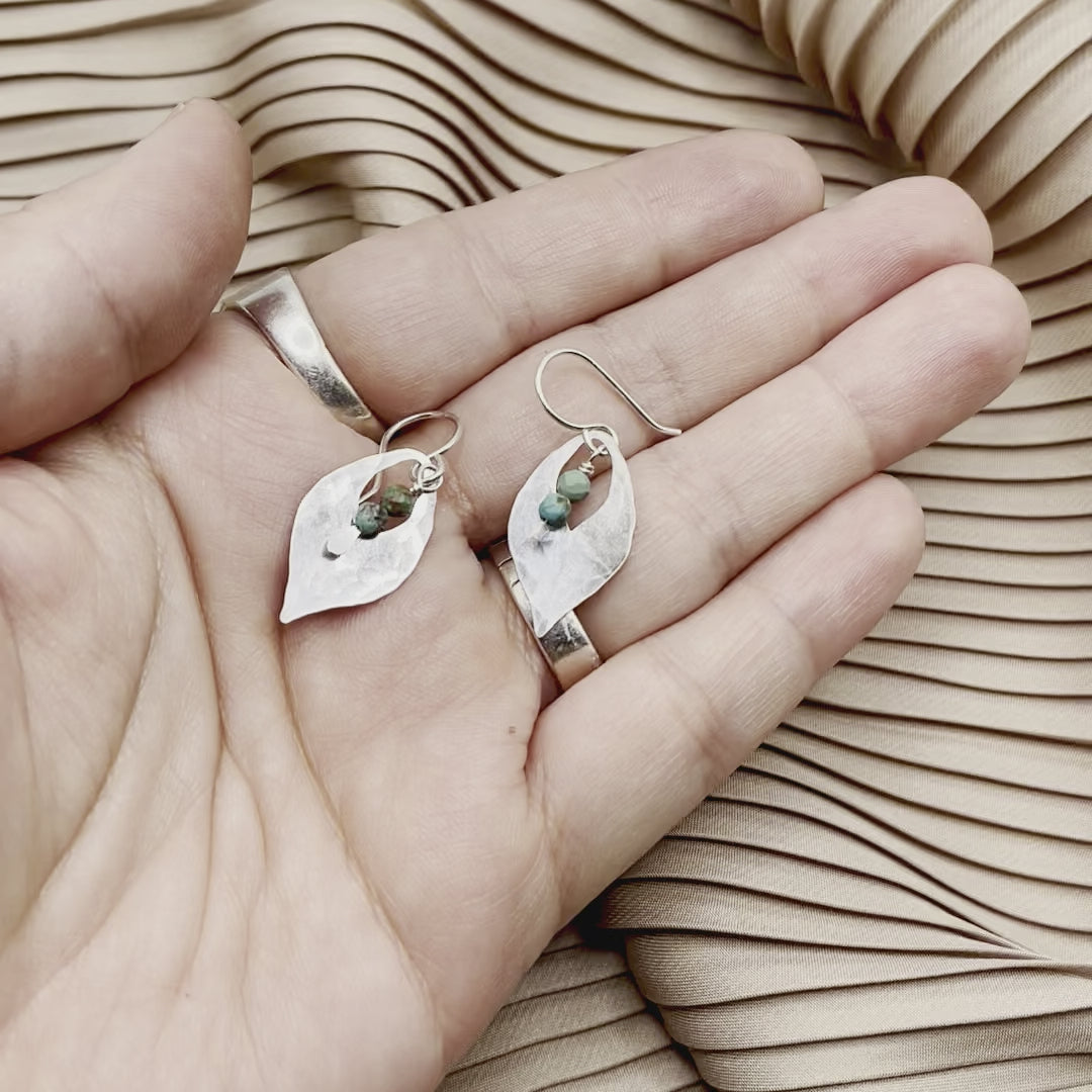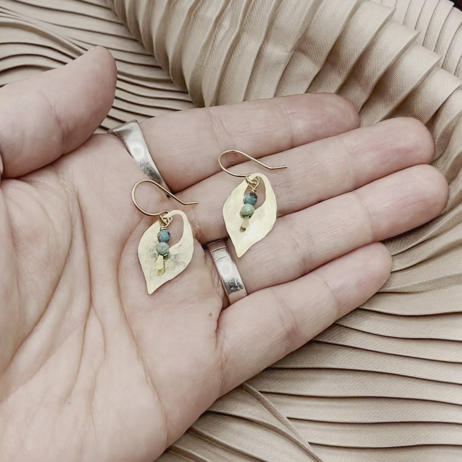 Gold or silver leaf shaped pendants and turquoise beads hang from 14 karat gold filled or sterling silver ear wire.
