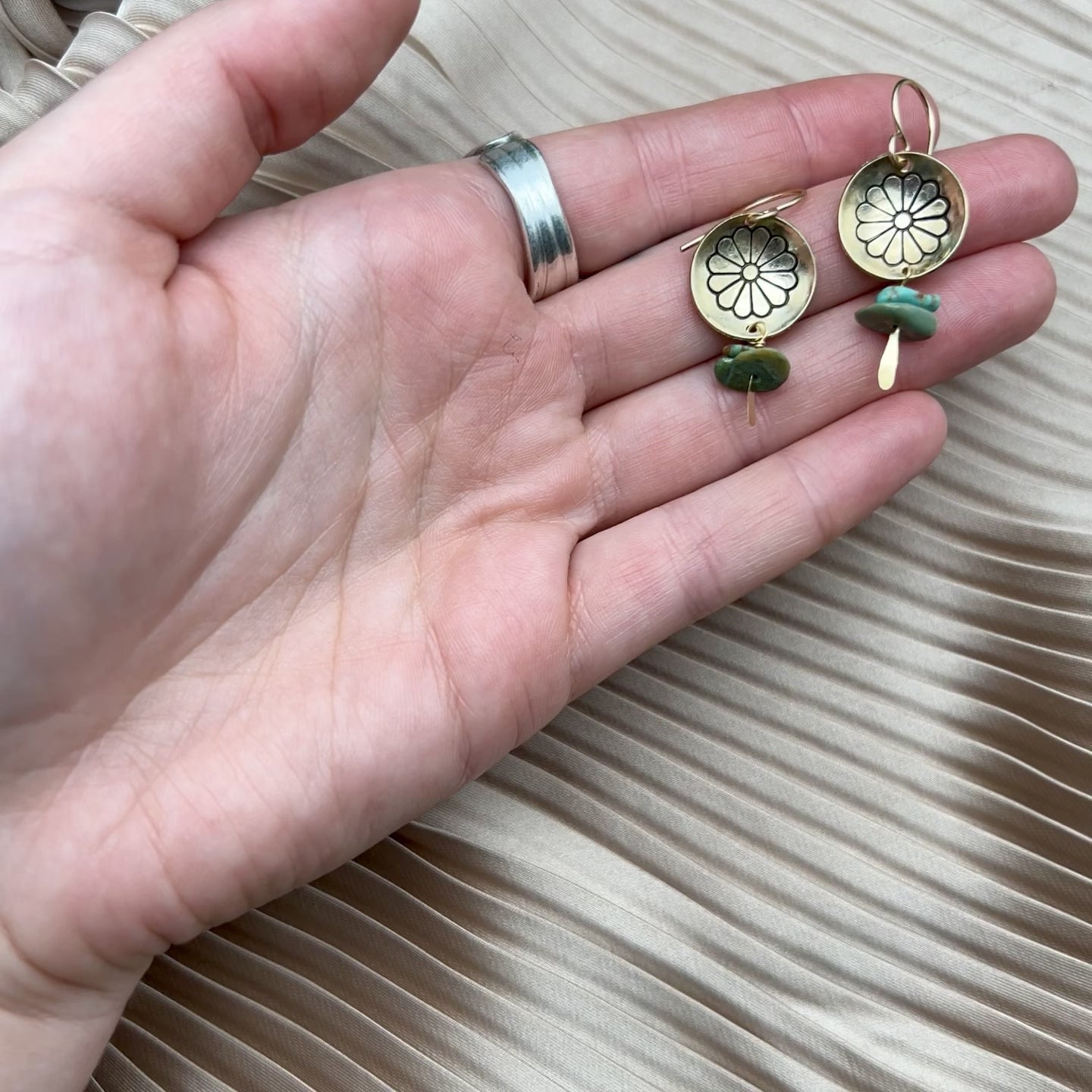 Gold or silver flower stamped pendants with turquoise stones that hang from 14 karat gold filled or sterling silver ear wire.