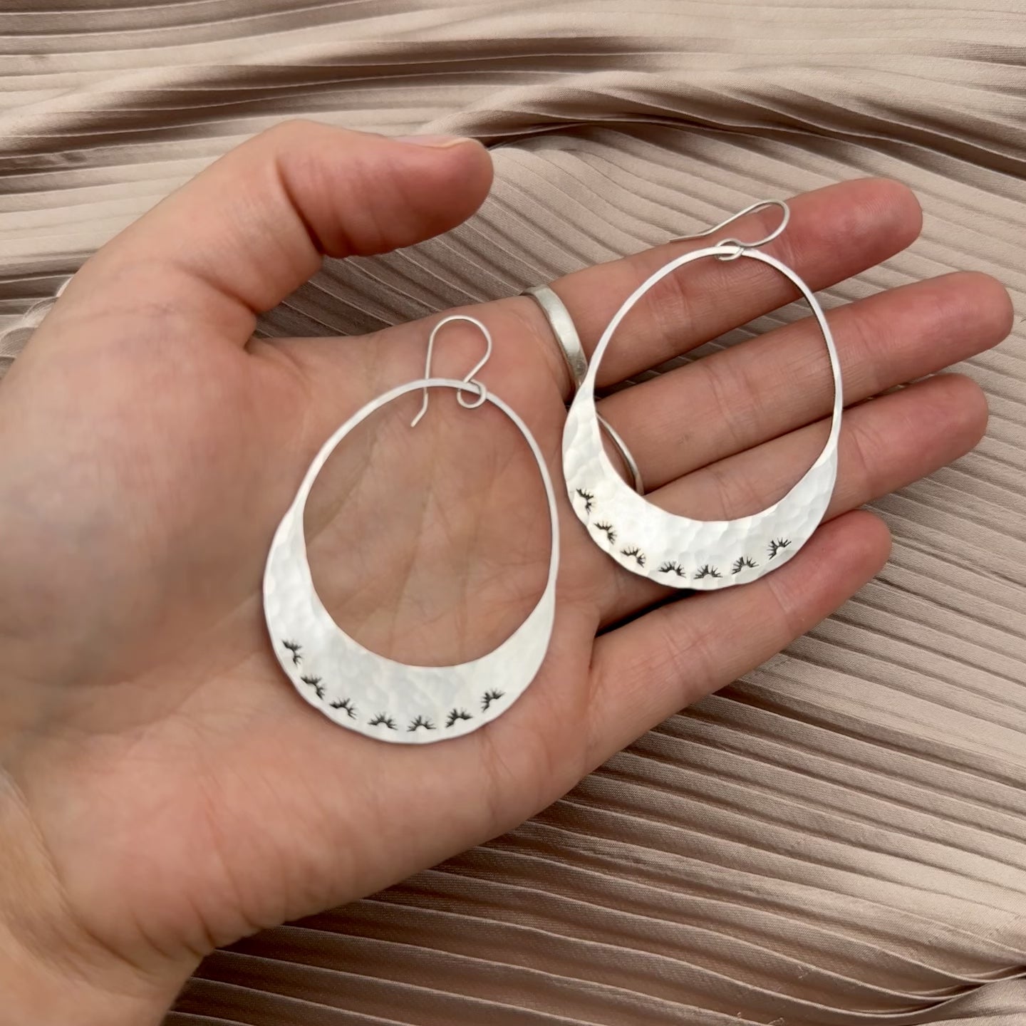 Handcrafted with care, these earrings feature an organic hoop shape, stamped and textured for a one-of-a-kind finish. Subtle yet striking, they dangle from 14k gold-filled or sterling silver ear wires, adding a touch of luminous charm to any outfit.
