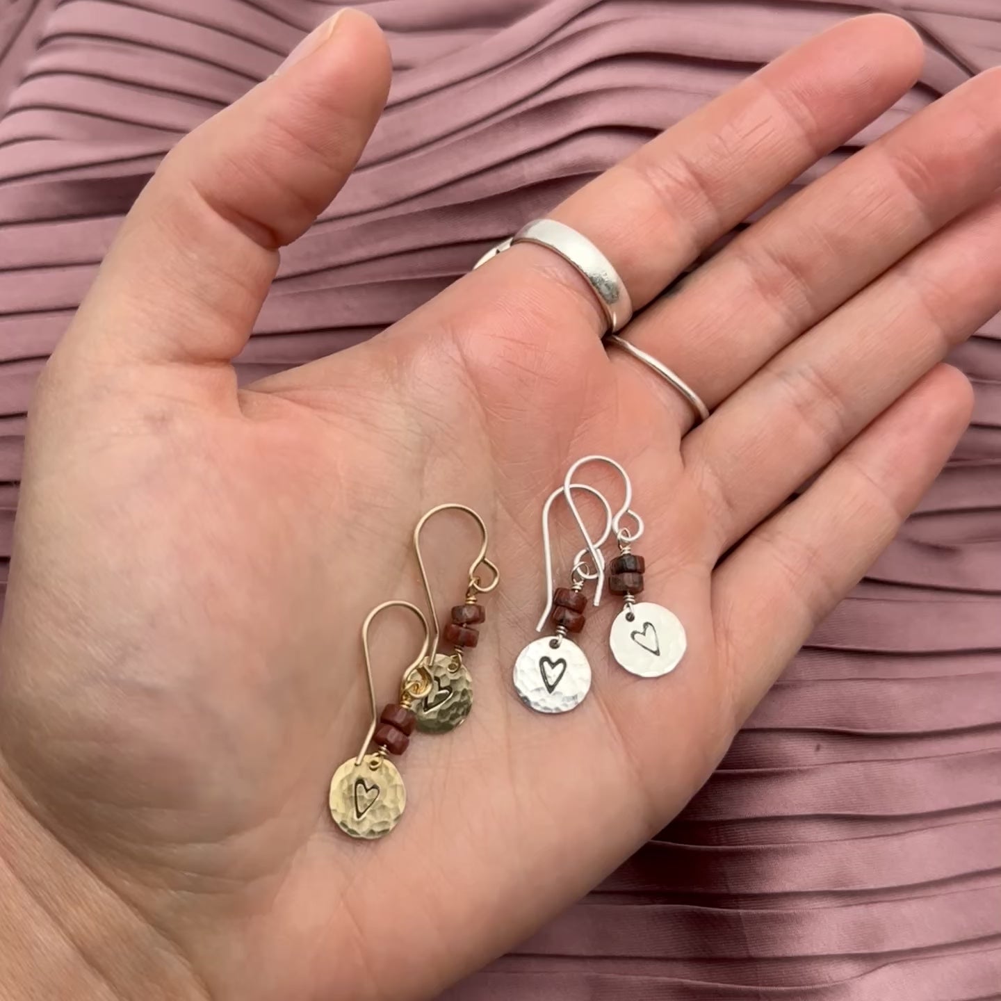 The Margot Earrings feature a petite heart-stamped disc hanging below two red jasper heishi beads. Finished on handmade sterling silver or 14k gold fill ear wires. A tiny pop of love you can wear year-round! ♡