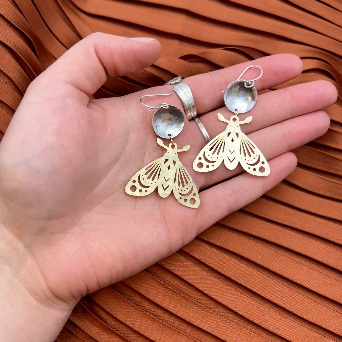 Gold or silver moth pendant and a mixed metal dapped circle that hang from a handmade 14 karat gold filled or sterling silver ear wire.