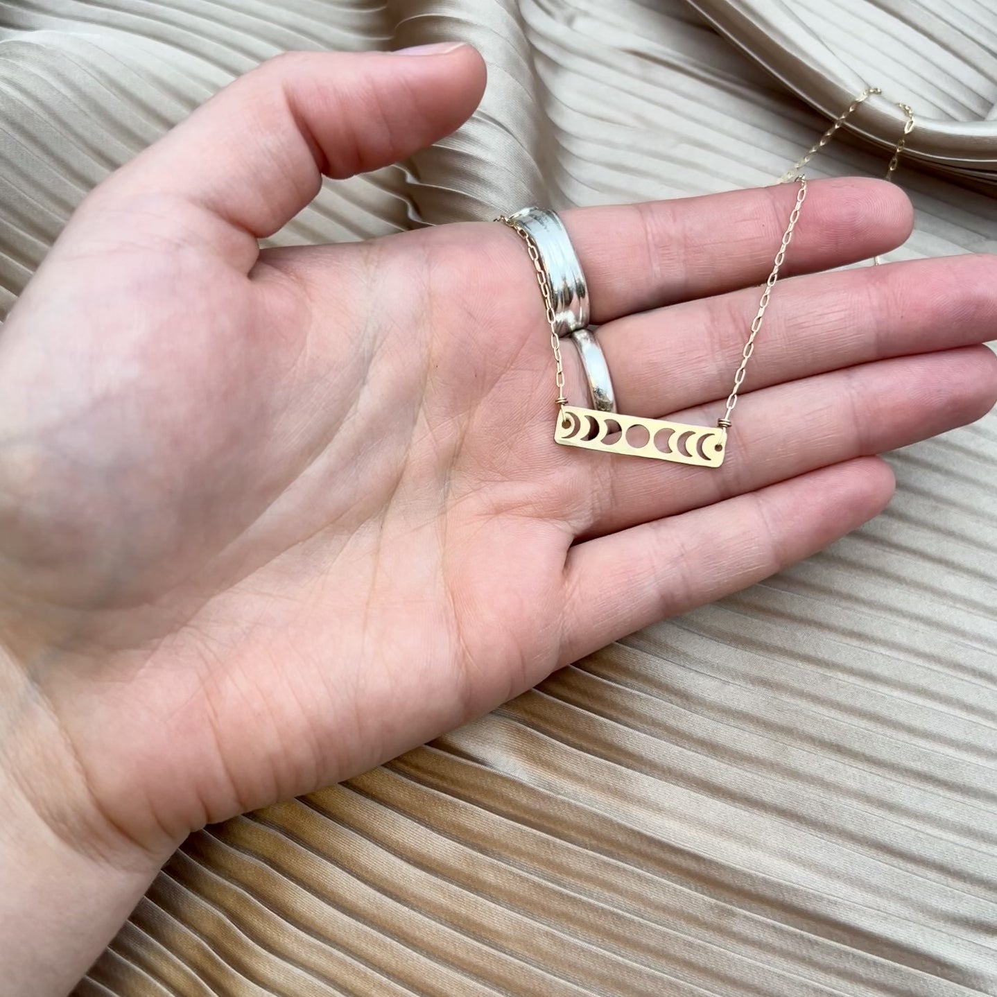 Moon phase cut out pendant on a 14 karat gold filled chain.