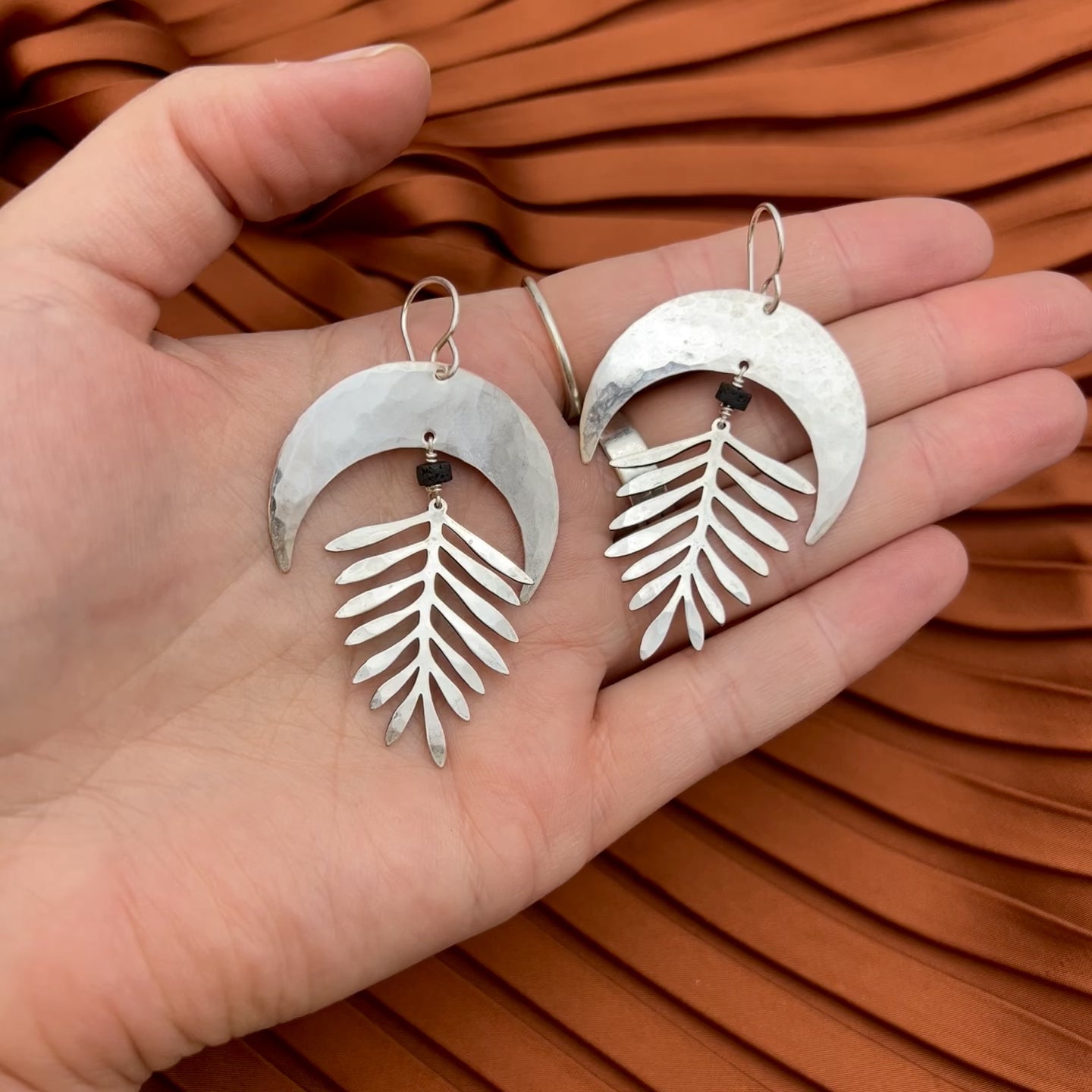 Gold or silver moon and leaf pendants with a black Heishi bead that hang from handmade 14 karat gold filled or sterling silver ear wire.