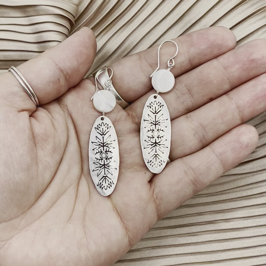 Gold or silver textured pendant and square mother of pearl bead that hangs from 14 karat gold filled or sterling silver ear wire.