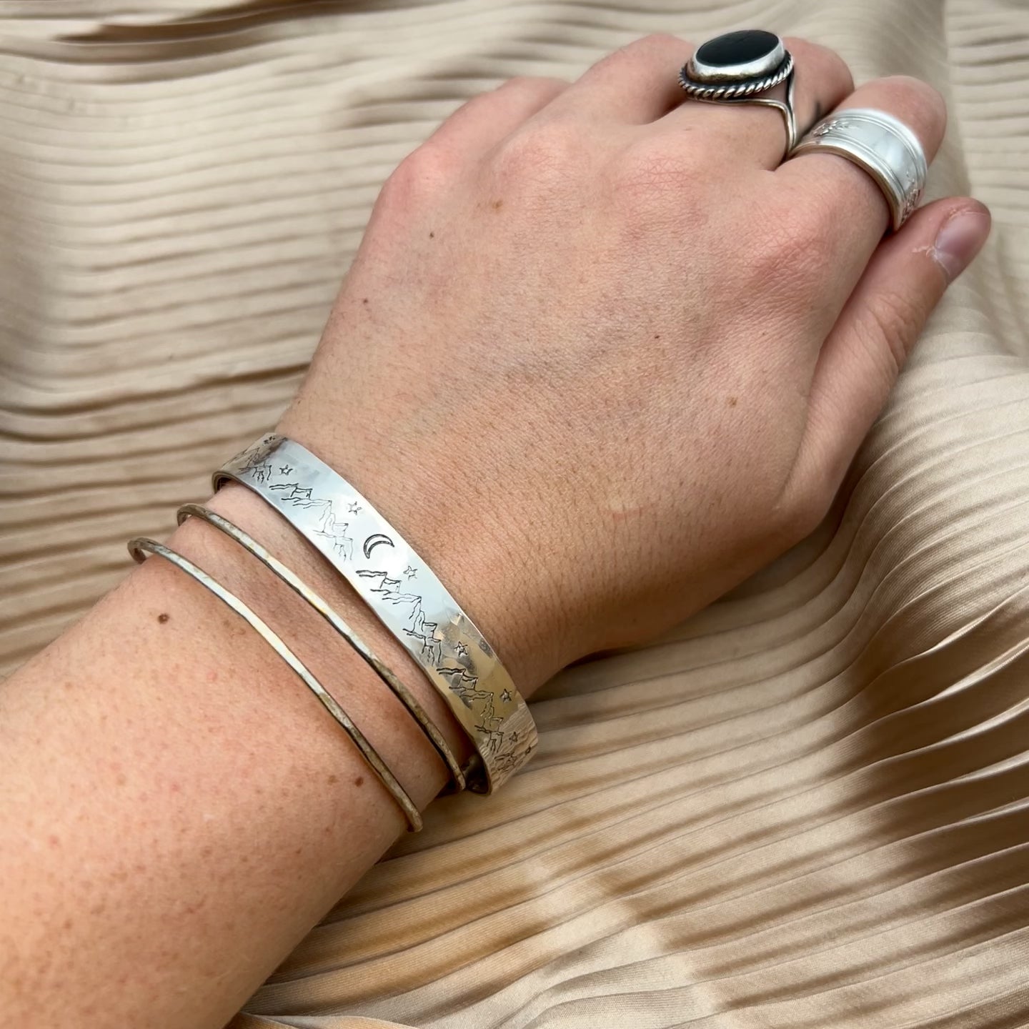 Material Note: Our cuffs are crafted from raw jeweler’s brass and sterling silver–plated brass. Because raw brass naturally interacts with each person’s unique skin chemistry, reactions can vary—some wearers will enjoy a lasting shine with no change, while others may notice a temporary green tint where the cuff touches their skin. This is a normal and harmless reaction that depends on your body’s pH.
