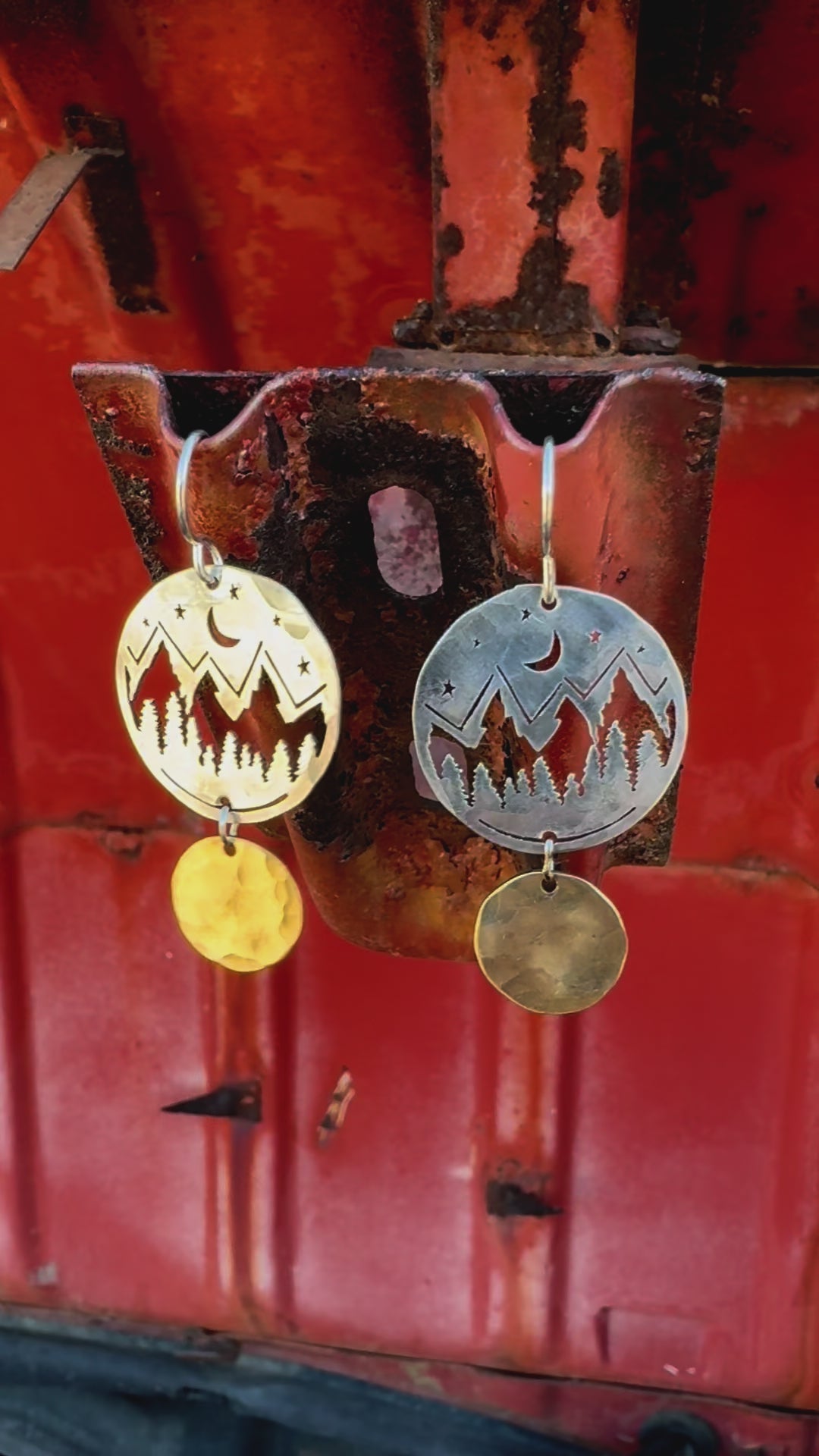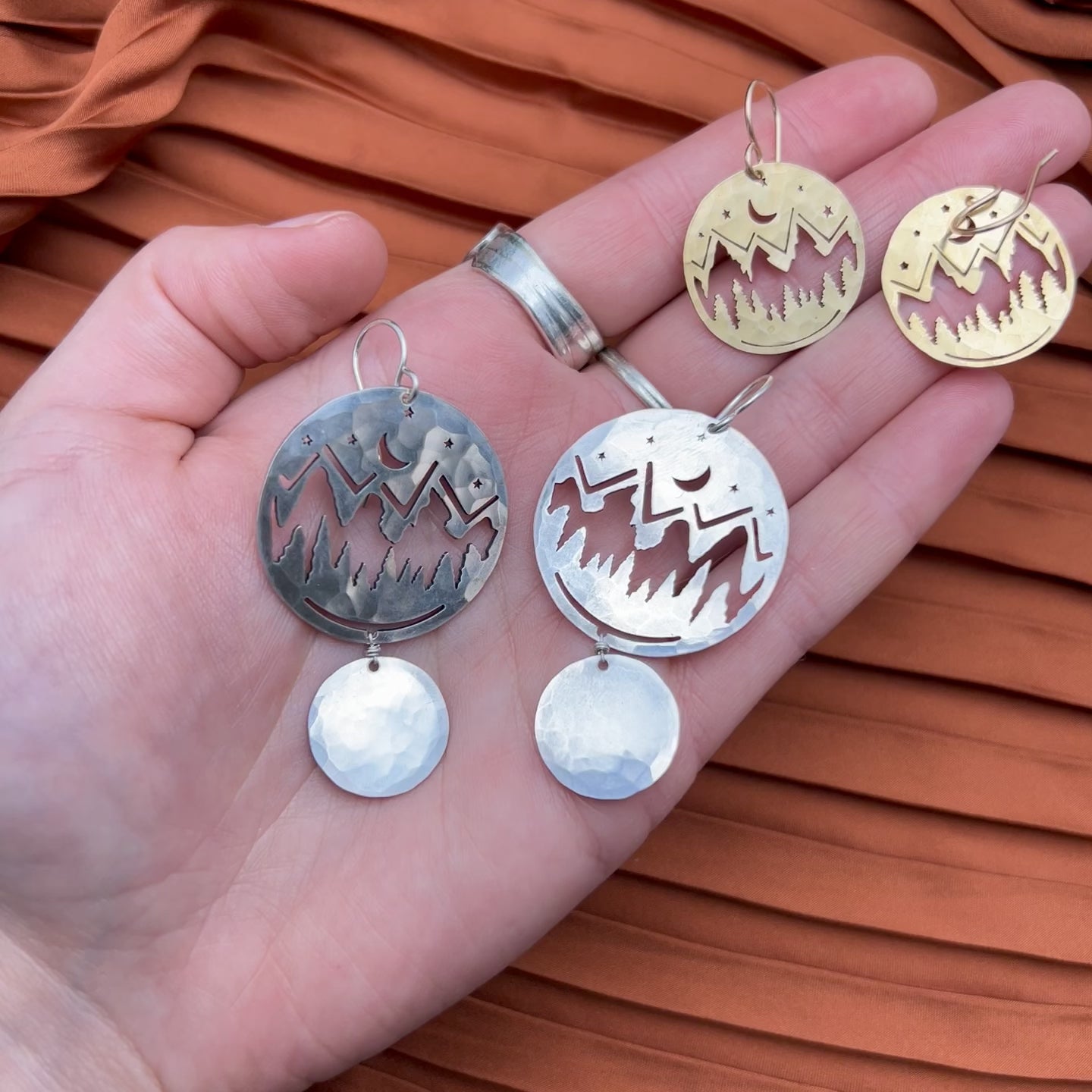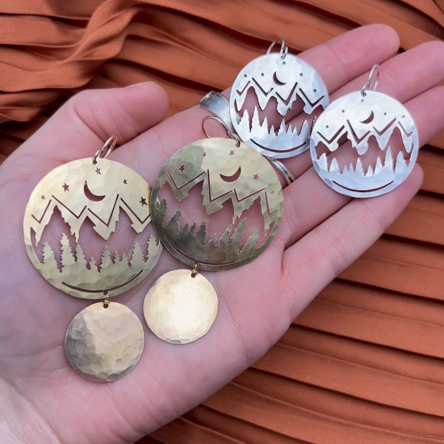 Idaho mountain scene cut into gold or silver pendants that hang from 14 karat gold filled ear wire or sterling silver ear wire. Available in various sizes and metal finishes.