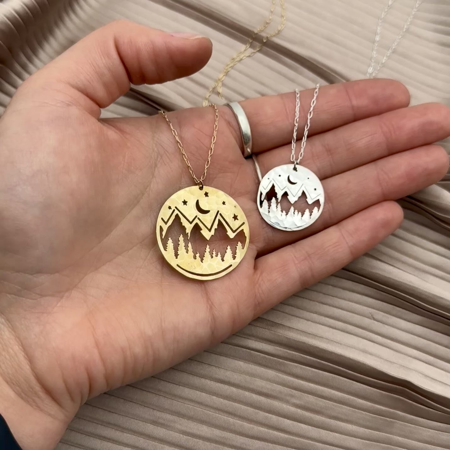 The Mountain Nights Necklace brings Idaho’s outdoor landscape to life in a finely engraved circular pendant. Featuring a mountain scape with pine trees beneath a starry night sky and crescent moon, this pendant captures the calm and wonder of nature.
