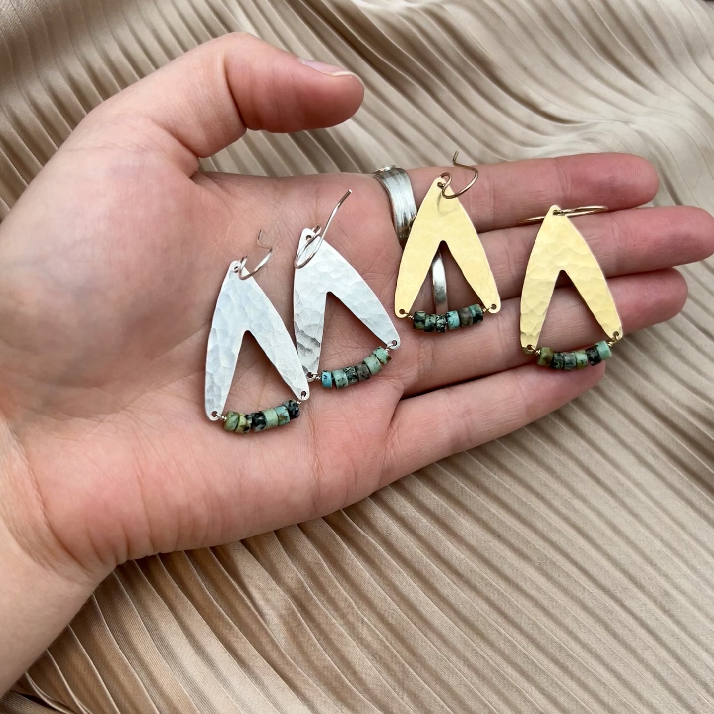 Ear wires and necklace chains are hypoallergenic and are sterling silver or 14 karat gold filled. Gold and silver pendant pieces are made of raw brass or sterling silver plated brass and can be polished the same as all other precious metals.