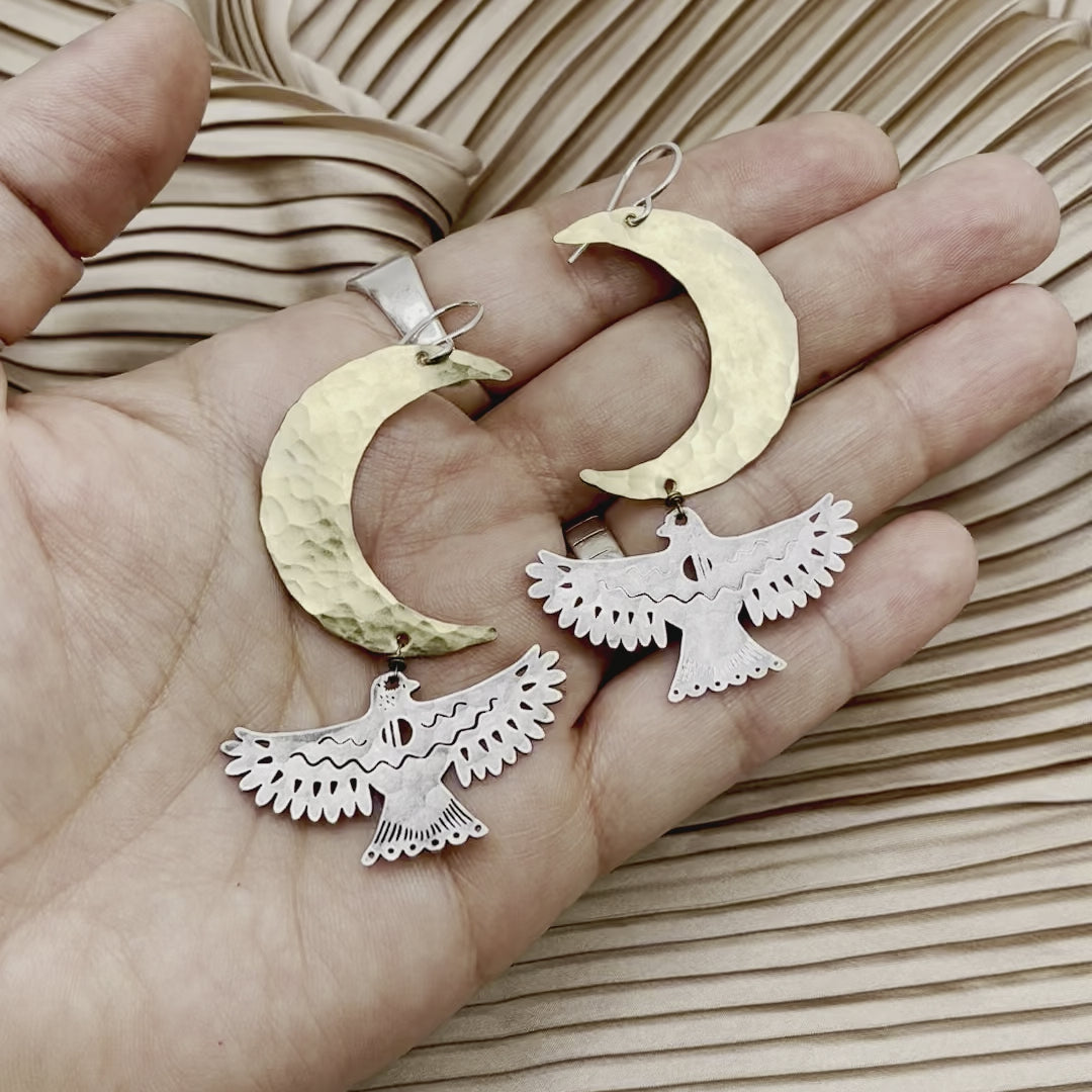 Perfect for the woman who embraces both elegance and a hint of wildness. These earrings feature an outstretched bird hanging below a crescent moon, creating a graceful, storytelling silhouette. Choose mixed metal or all silver/gold.