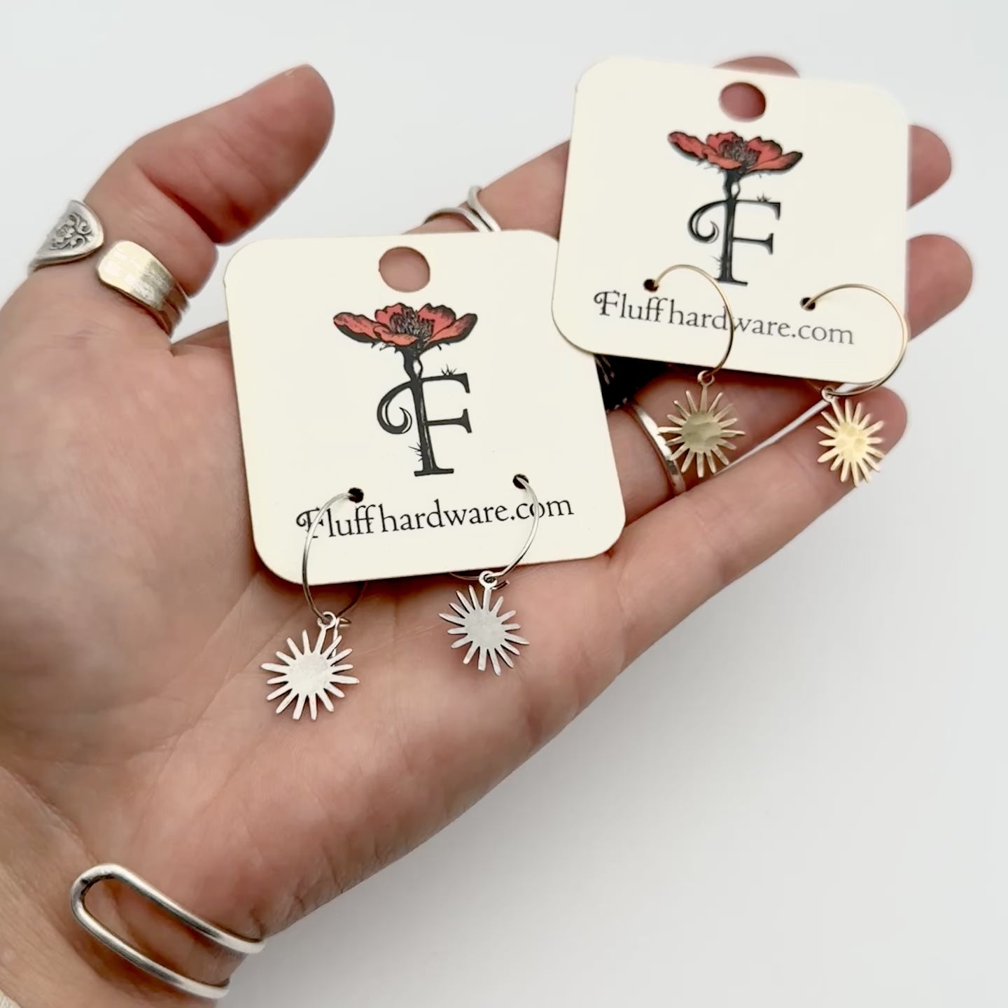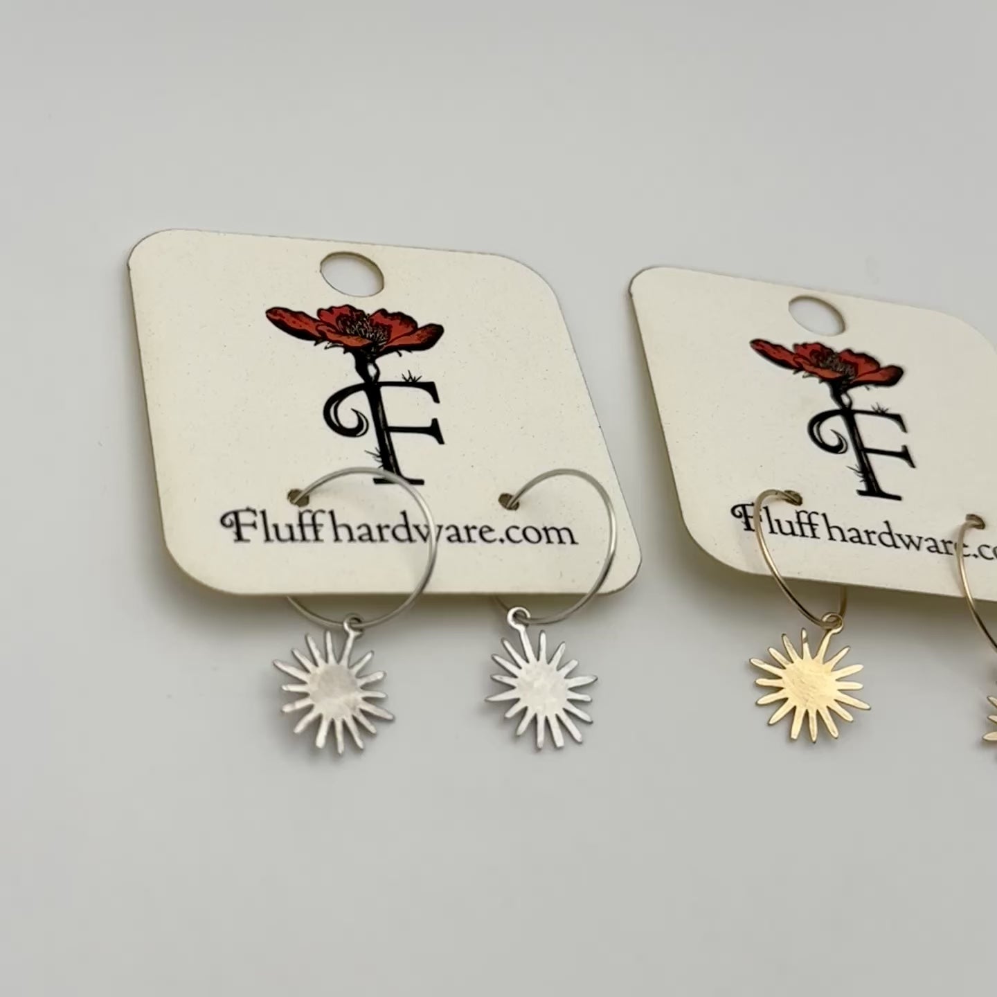 Textured star bursts hang from handmade Sterling Silver & 14 Karat Gold Fill hoop ear wires.