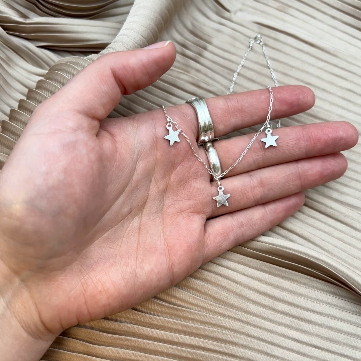 Three hammered gold or silver star pendants that hang from a sterling silver or 14 karat gold filled chain.