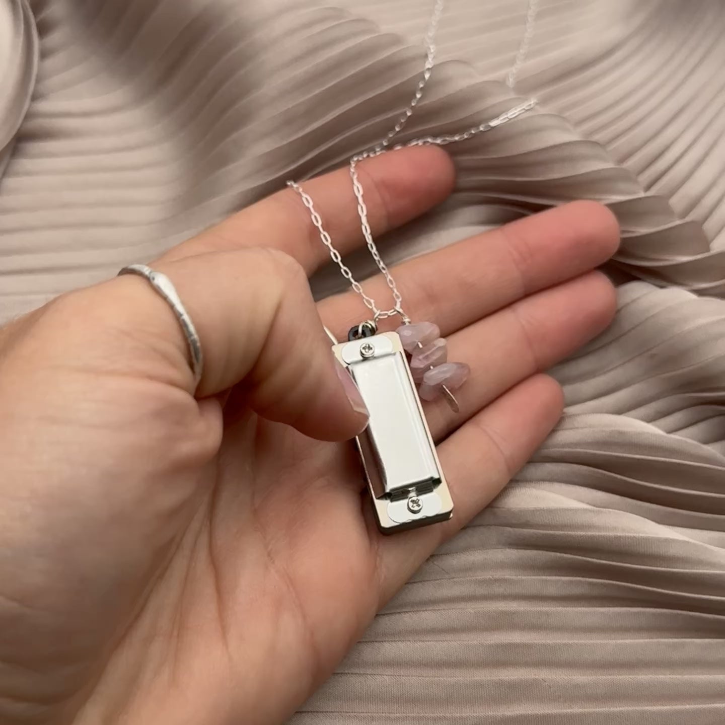 Steal the spotlight with our Party Trick Necklace—mini harmonica charm plus three rose quartz beads for a little sparkle and a lot of personality.