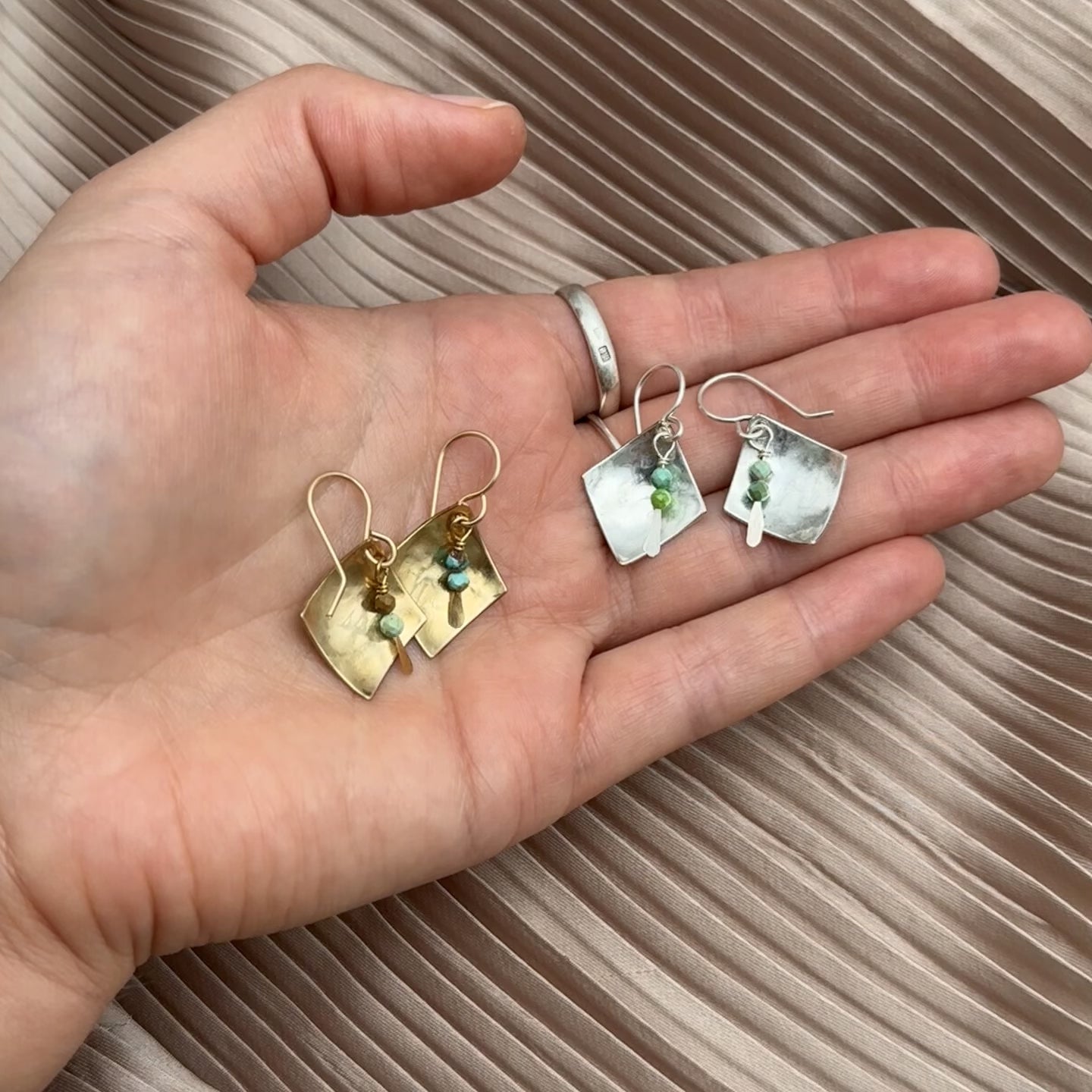 Small gold or silver pendants with turquoise stones that hang from 14 karat gold filled or sterling silver ear wire.