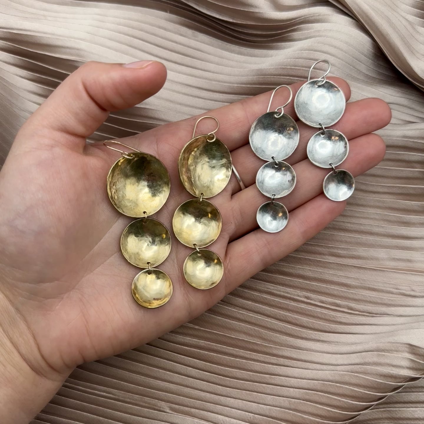 Three gold or silver circular dapped pendants that hang from sterling silver or 14 karat gold filled ear wire.