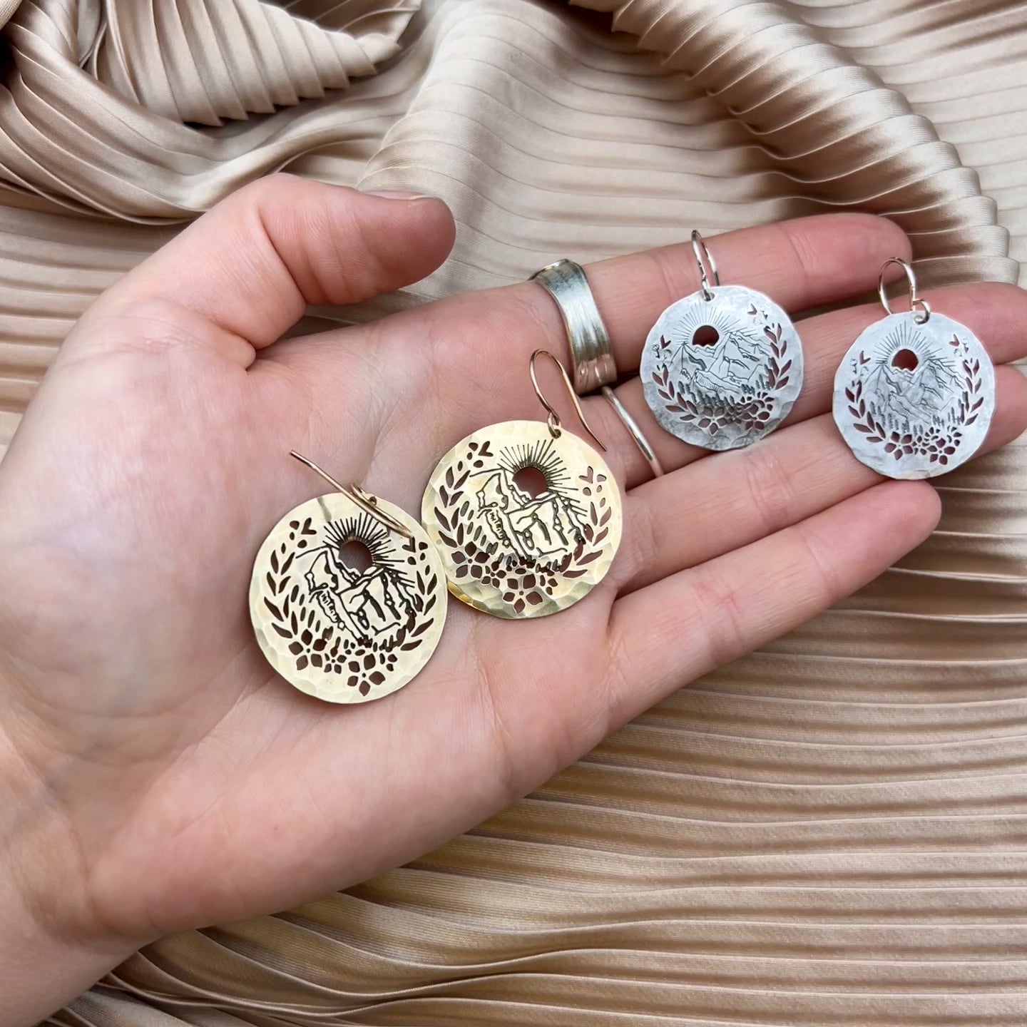 Gold or silver cut out pendants that hang from 14 karat gold filled or sterling silver ear wire.