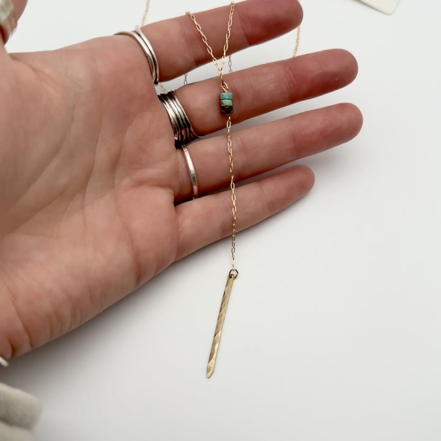 Three turquoise heishi beads and a point hang from Sterling Silver or 14 Karat Gold Fill chain.