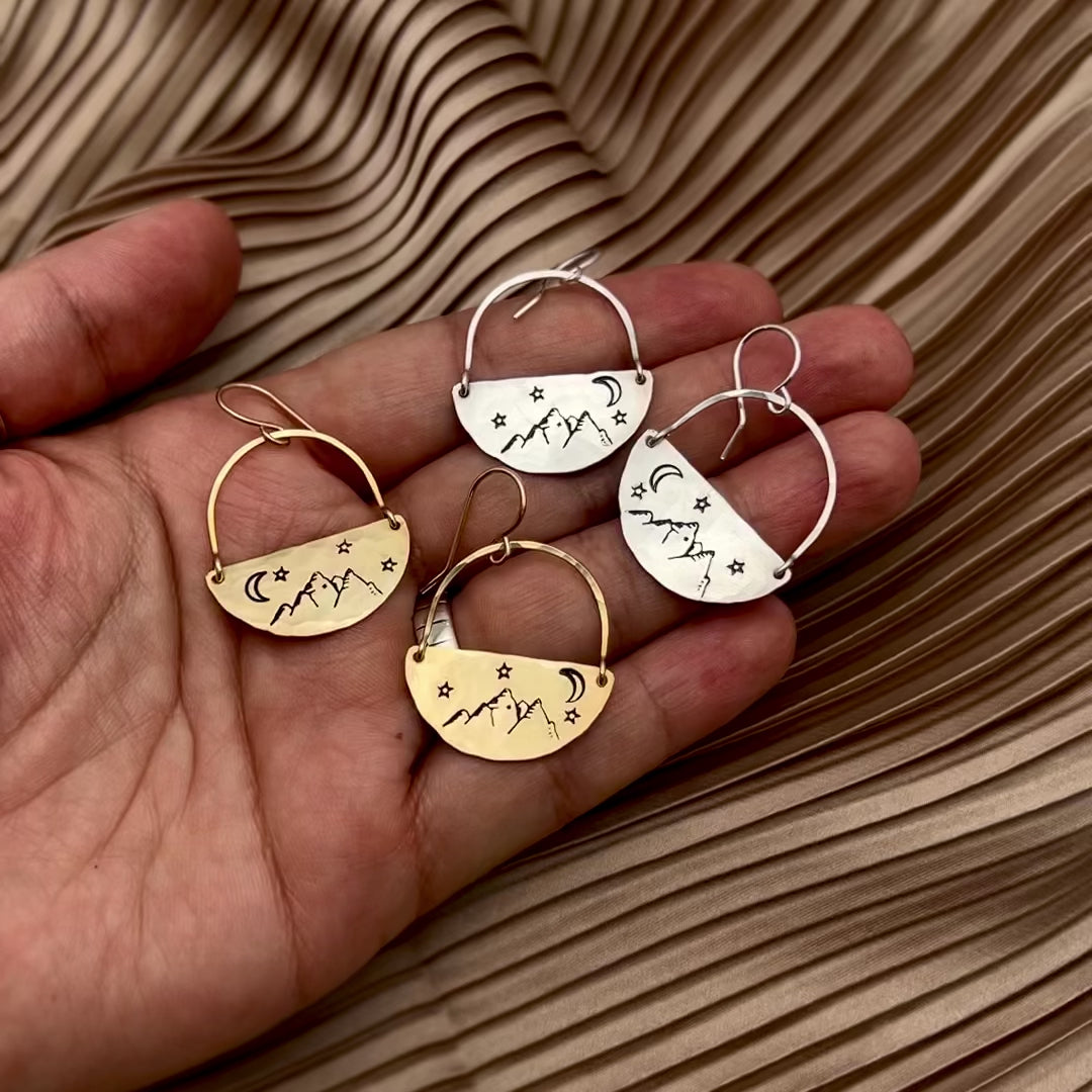 Mountain stamped pendants that hang from 14 karat gold filled or sterling silver ear wire.