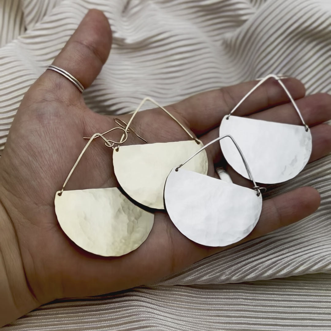 Hammered gold or silver pendants that hang from 14 karat gold filled or sterling silver handmade ear wire.