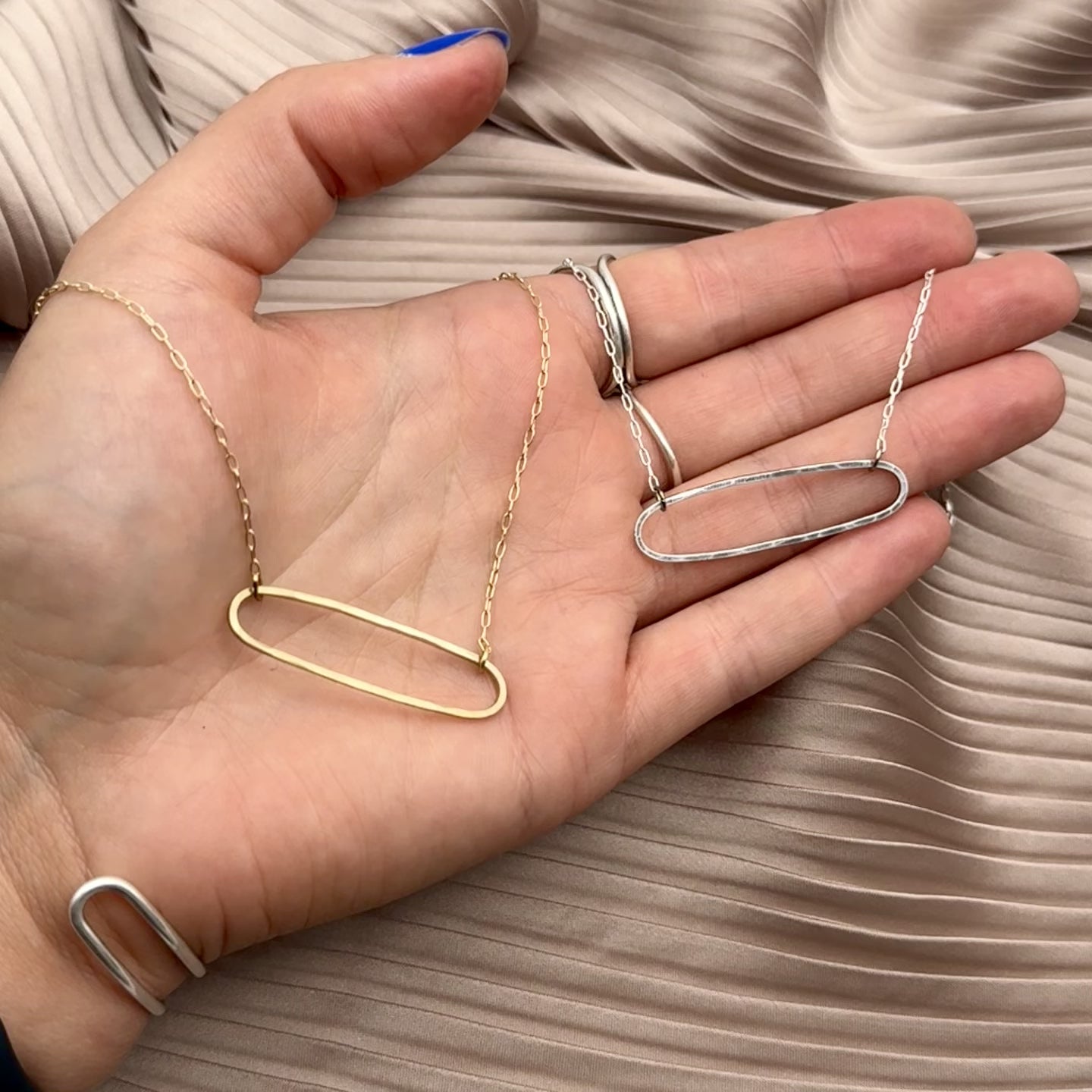 Gold or silver pendant that hangs from a sterling silver or 14 karat gold filled chain.