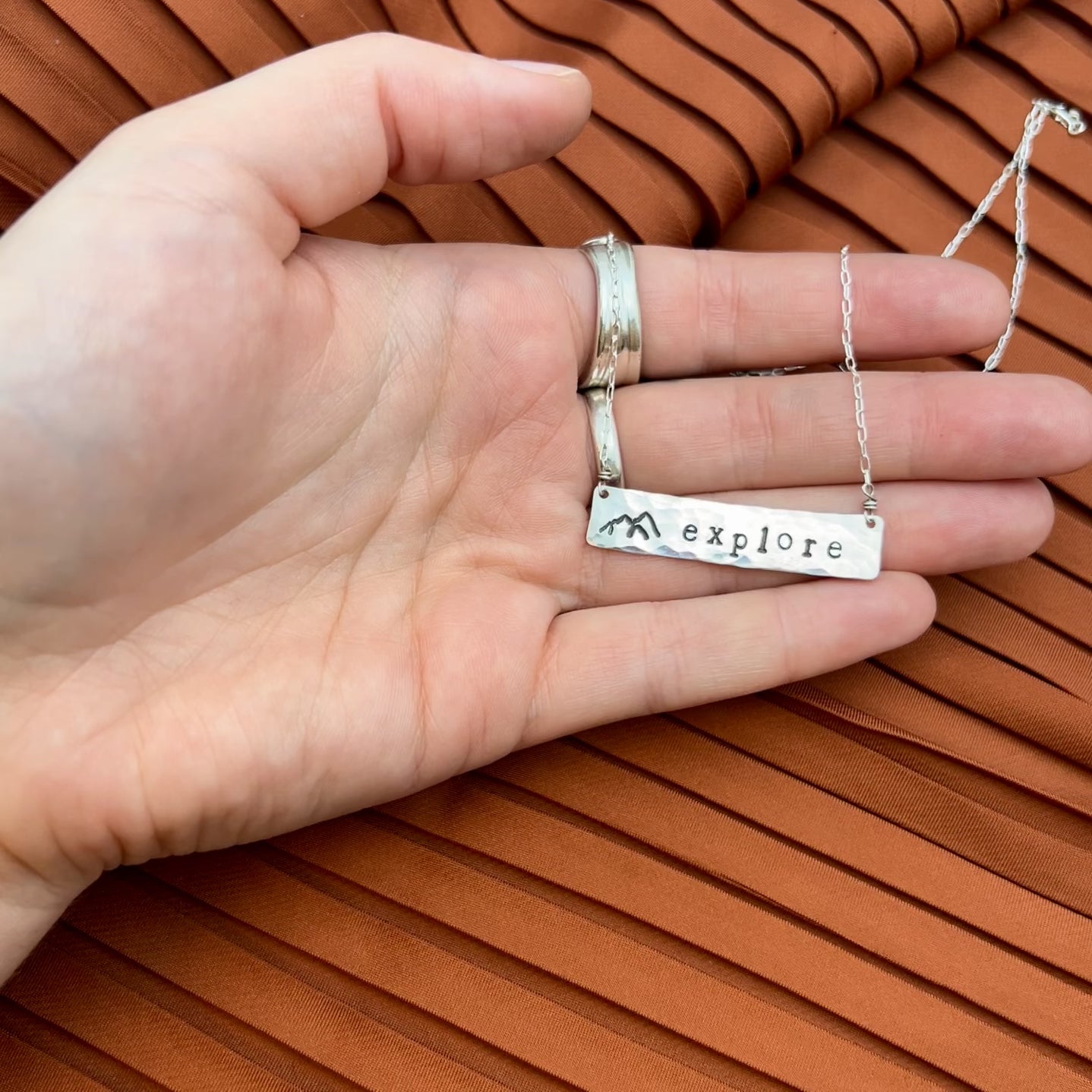 Stamped bar pendant on a sterling silver or 14 karat gold filled chain.