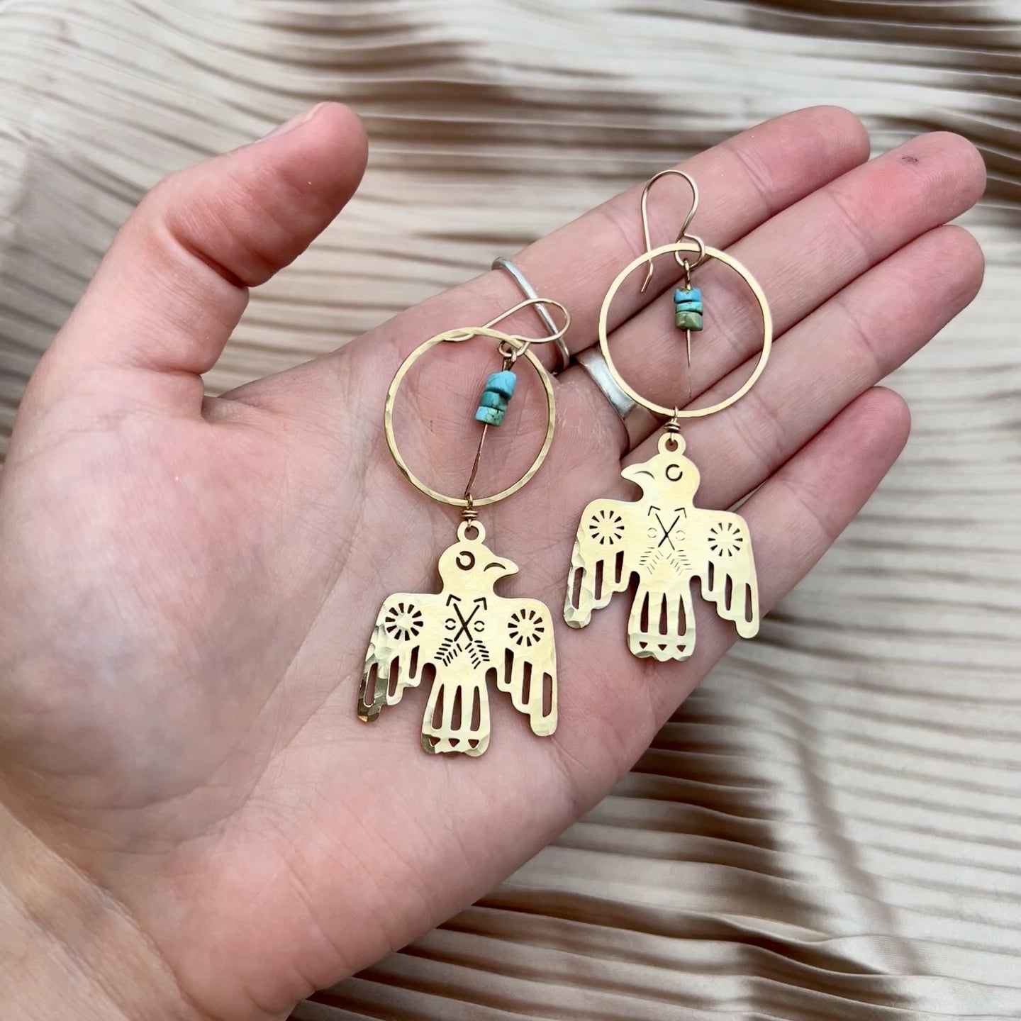Silver or gold hoops with bird pendants and Turquoise Heishi beads that hang from sterling silver or 14 karat gold filled ear wire.