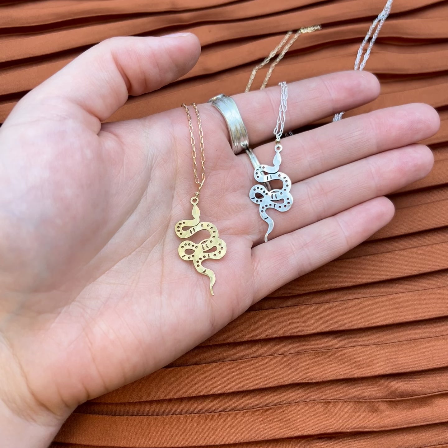Gold or silver snake pendant with green aventurine bead that hangs from a 14 karat gold filled or sterling silver chain.