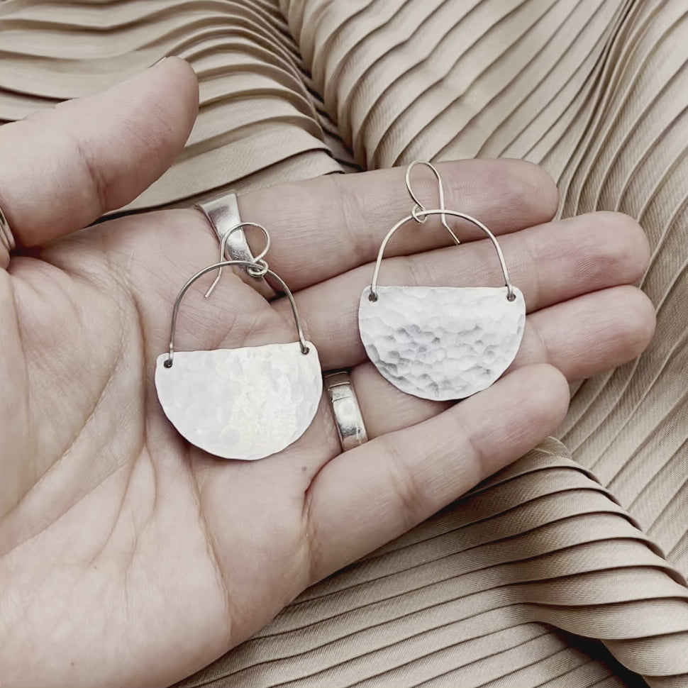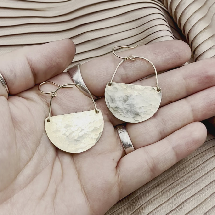 Hammered gold or silver pendants that hang from sterling silver or 14 karat gold filled ear wire.